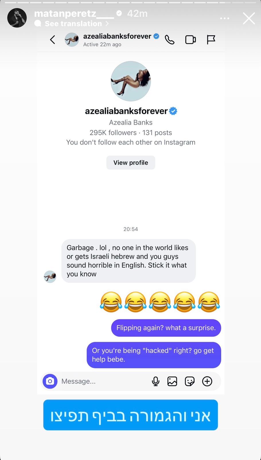 הראפרית האמריקאית אזיליה בנקס, שהגיעה לישראל והופיעה תל אביב, מתהפכת שוב בנקס, הפכה באחרונה לתומכת נלהבת של ישראל לאחר שכבר הייתה אנטשימית בעבר כעת היא מתהפכת שוב עם "ביף" תקשורתי עם הסטנדפיסט הידוע מתן פרץ