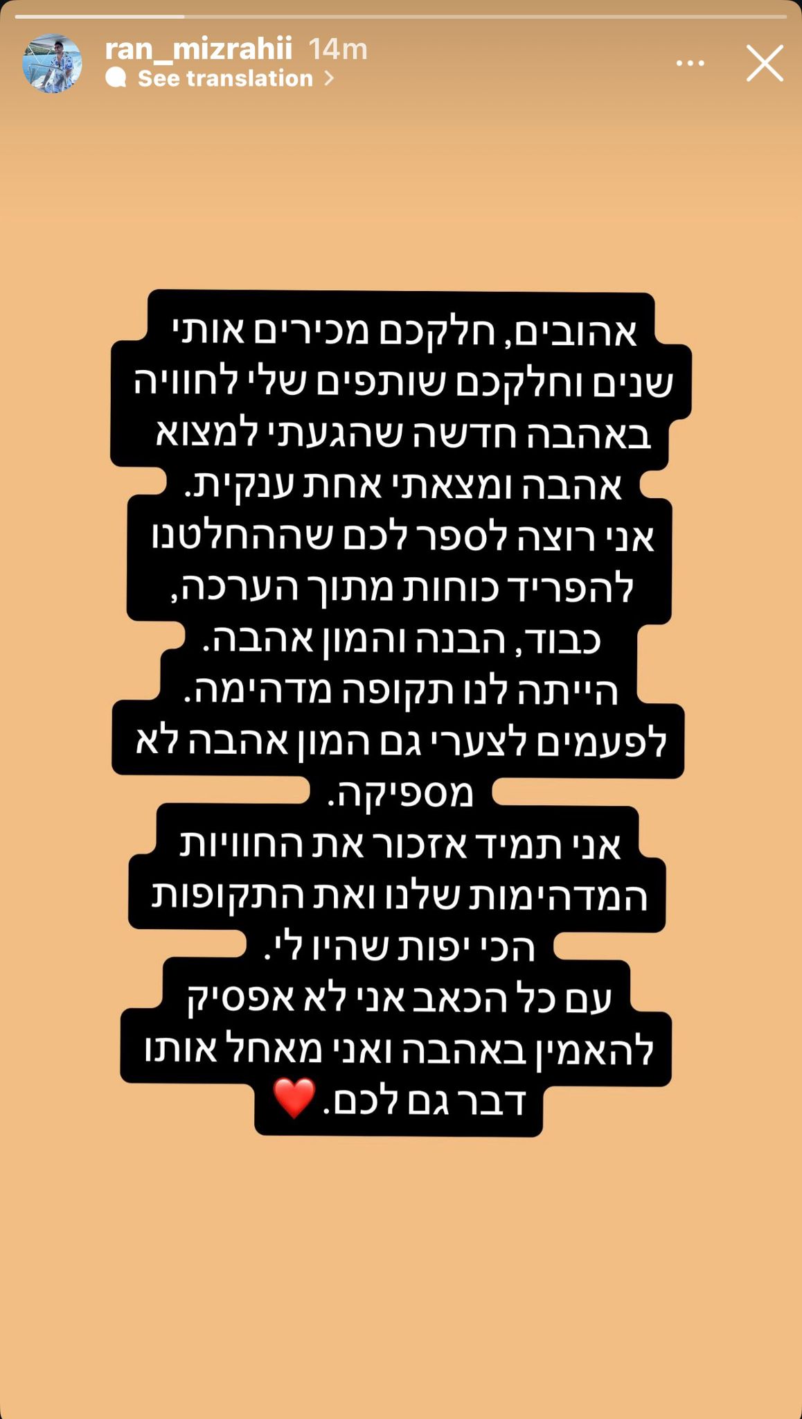 לאחר מכן, שיתף רן על הפרידה גם הוא בסטורי וכתב: "אהובים, חלקכם מכירים אותי שנים וחלקכם שותפים שלי לחוויה ב'אהבה חדשה' שהגעתי למצוא אהבה ומצאתי אחת ענקית. אני רוצה לספר לכם שהחלטנו להפריד כוחות מתוך הערכה, כבוד, הבנה והמון אהבה. הייתה לנו תקופה מדהימה.ל פעמים לצערי גם המון אהבה לא מספיקה".
