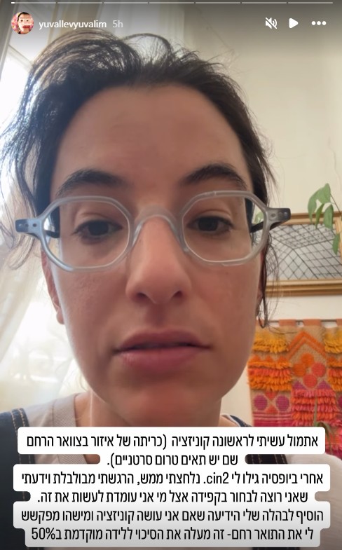 כוכבת העונה ה־13 של "האח הגדול", יובל לוי, פתחה היום (רביעי) את הלב בפני עוקביה בסטורי מצולם באינסטגרם וחשפה כי עברה כריתה חלקית באזור צוואר הרחם. לוי סיפרה כי ההליך בוצע בעקבות גילוי תאים טרום סרטניים, וכי חששה מאוד מההשפעות האפשריות על הריונות עתידיים.