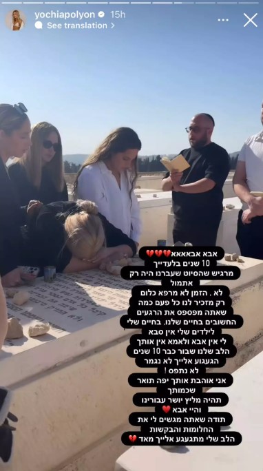 יוכי העלתה סטורי אליו צירפה תמונה שלה כשהיא מניחה את ראשה על הקבר של אביה וכתבה ברקע: "אבא אבא, עשר שנים בלעדיך. מרגיש שהסיוט שעברנו היה רק אתמול. לא, הזמן לא מרפא כלום. רק מזכיר לנו כל פעם כמה שאתה מפספס את הרגעים החשובים בחיים שלנו. בחיים שלי".