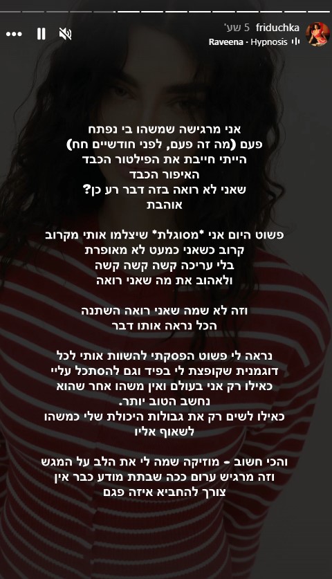הזמרת בת ה-27, פרידה עוזיאל שיתפה בגילוי לב את עוקביה בחשבון האינסטגרם שלה את התחושות שלה לאחרונה לגבי דימוי גופה.