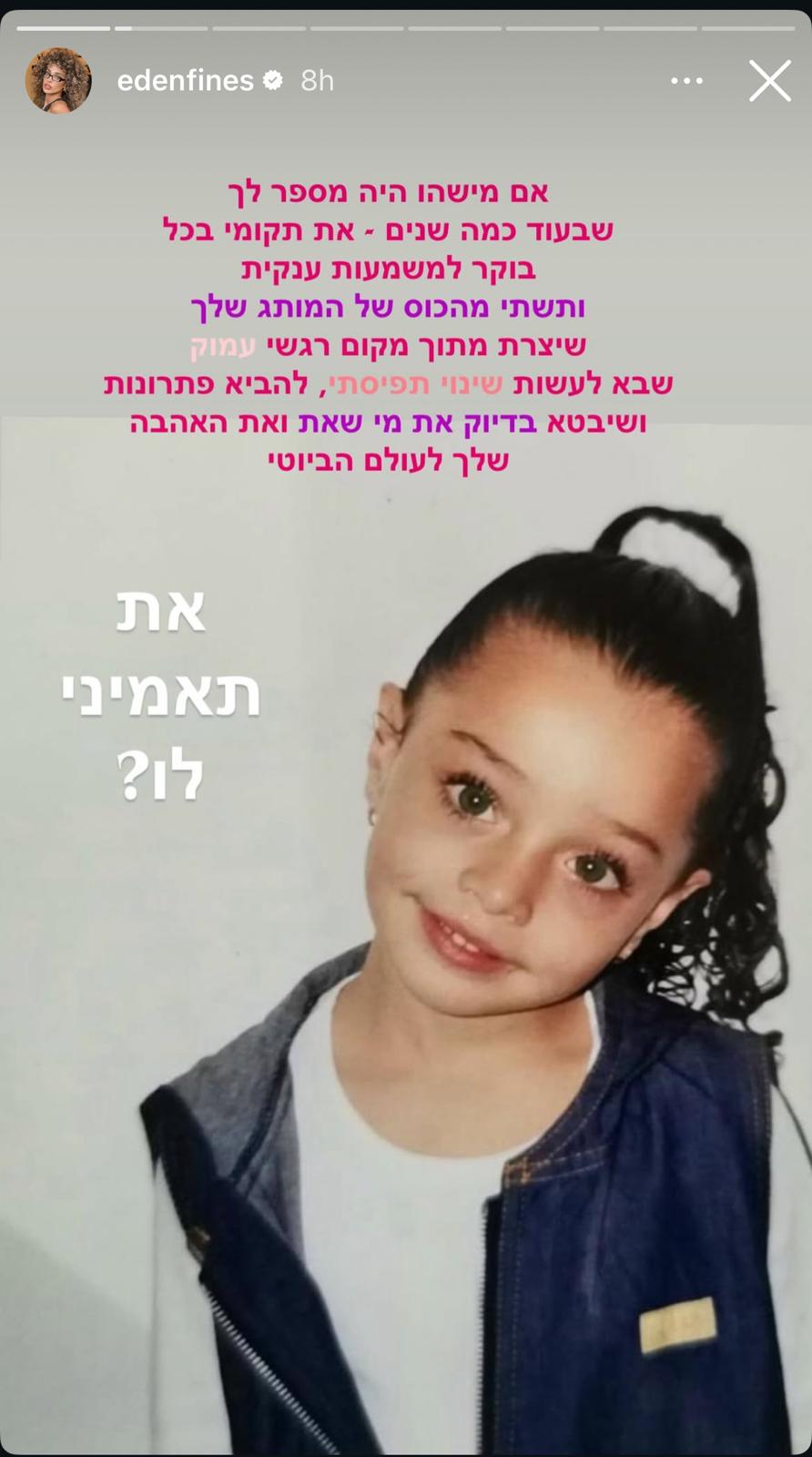 עדן פינס פרסמה היום (שני) מסר מרגש לעוקבים שלה באינסטגרם. בסטורי נראית תמונה של הכוכבת בתור ילדה "אם מישהו היה מספר לך - את תאמיני לו?"
