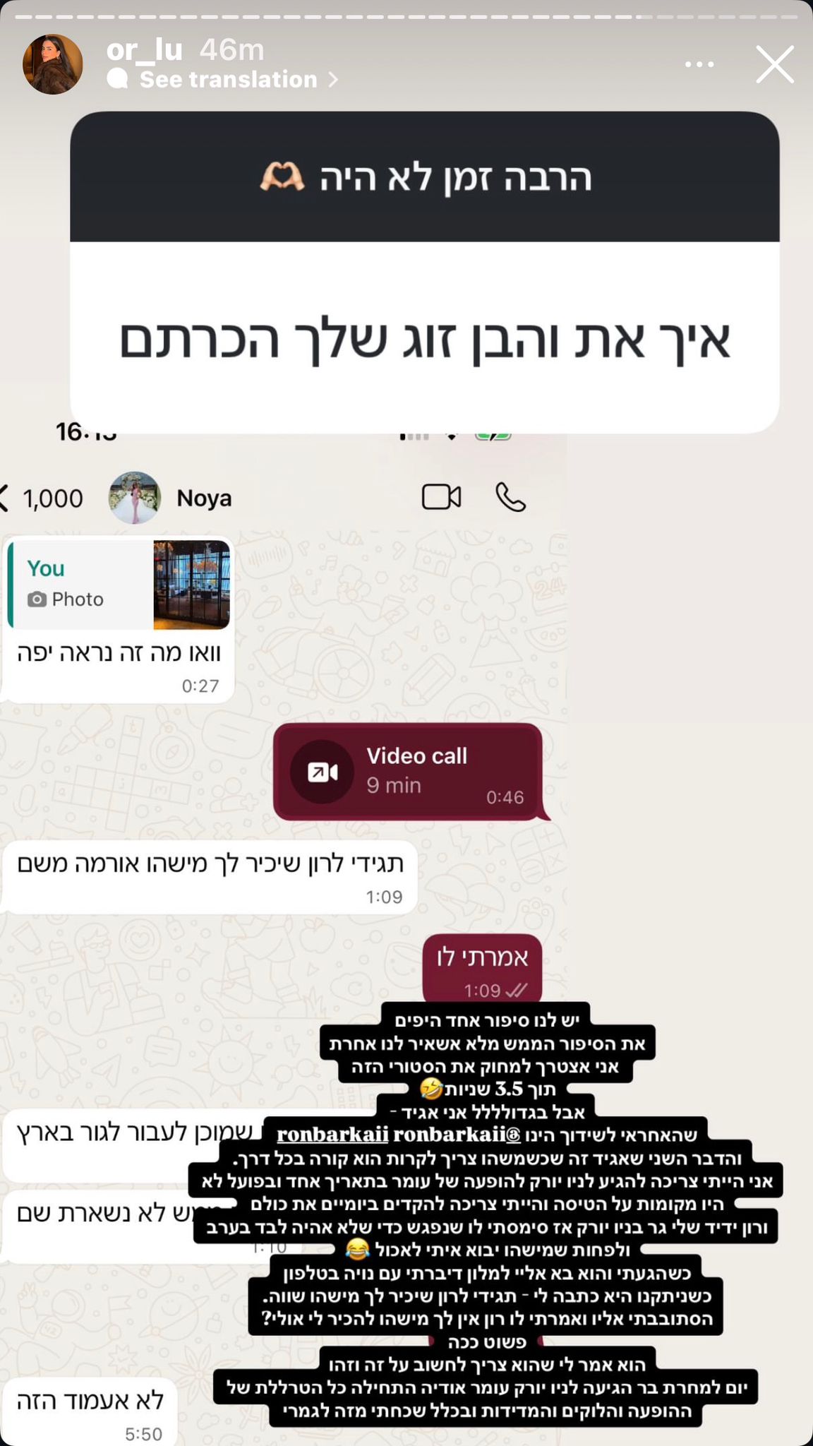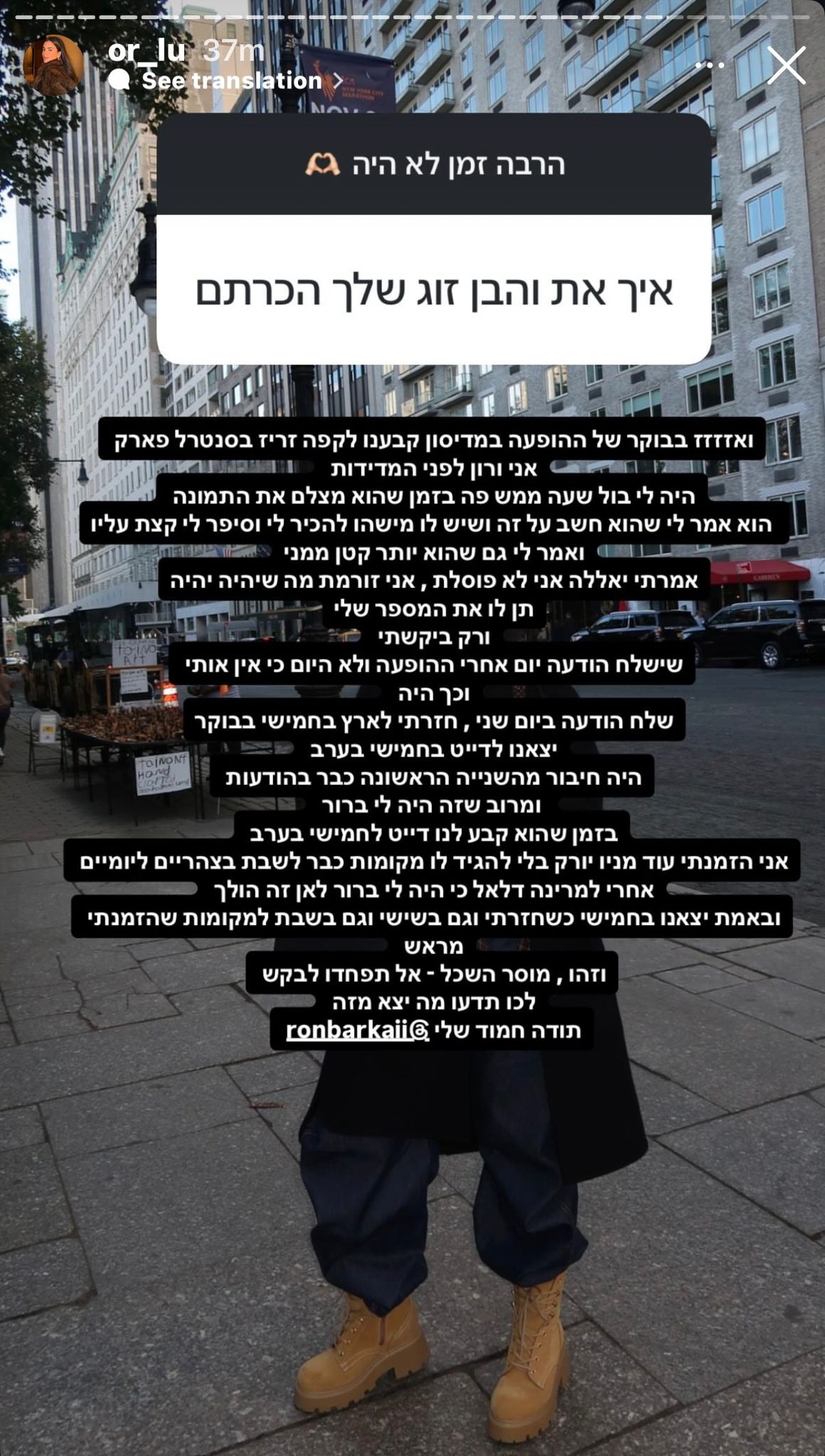 בסטורי נוסף לאחר מכן, כתבה לוזון על הדייט השני שקבעה עוד לפני שהראשון התקיים: "בזמן שהוא קבע לנו דייט לחמישי בערב, אני הזמנתי עוד מניו יורק בלי להגיד לו מקומות כבר לשבת בצהריים ליומיים אחרי במרינה דלאל, כי היה לי ברוך לאן זה הולך. ובאמת יצאנו בחמישי שחזרתי לארץ, וגם בשישי ובשבת למקומות שהזמנתי מראש"; צפו בסטורי עם דבריה המלאים בעניין.