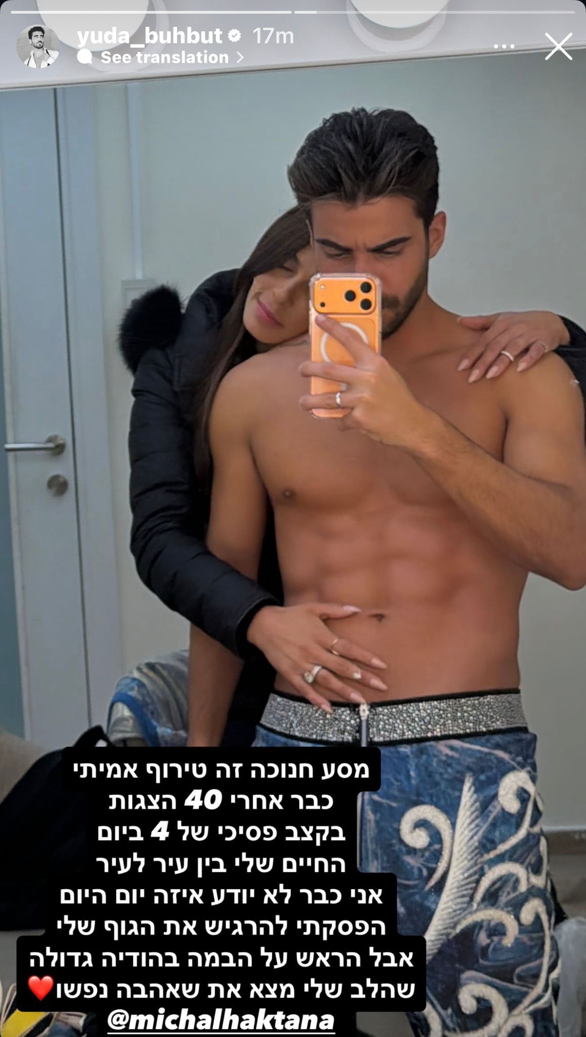 היום (שלישי) שיתף בוחבוט סטורי חדש בו הוא משתף את רגשותיו על מיכל, כך כתב: "מסע חנוכה זה טירוף אמיתי, כבר אחרי 40 הצגות, בקצב פסיכי של 4 ביום. החיים שלי בין עיר לעיר, אני כבר לא יודע איזה יום היום, הפסקתי להרגיש את הגוף שלי, אבל הראש על הבמה הודיה גדולה שהלב שלי מצא את שאהבה נפשו"; צפו בסטורי.