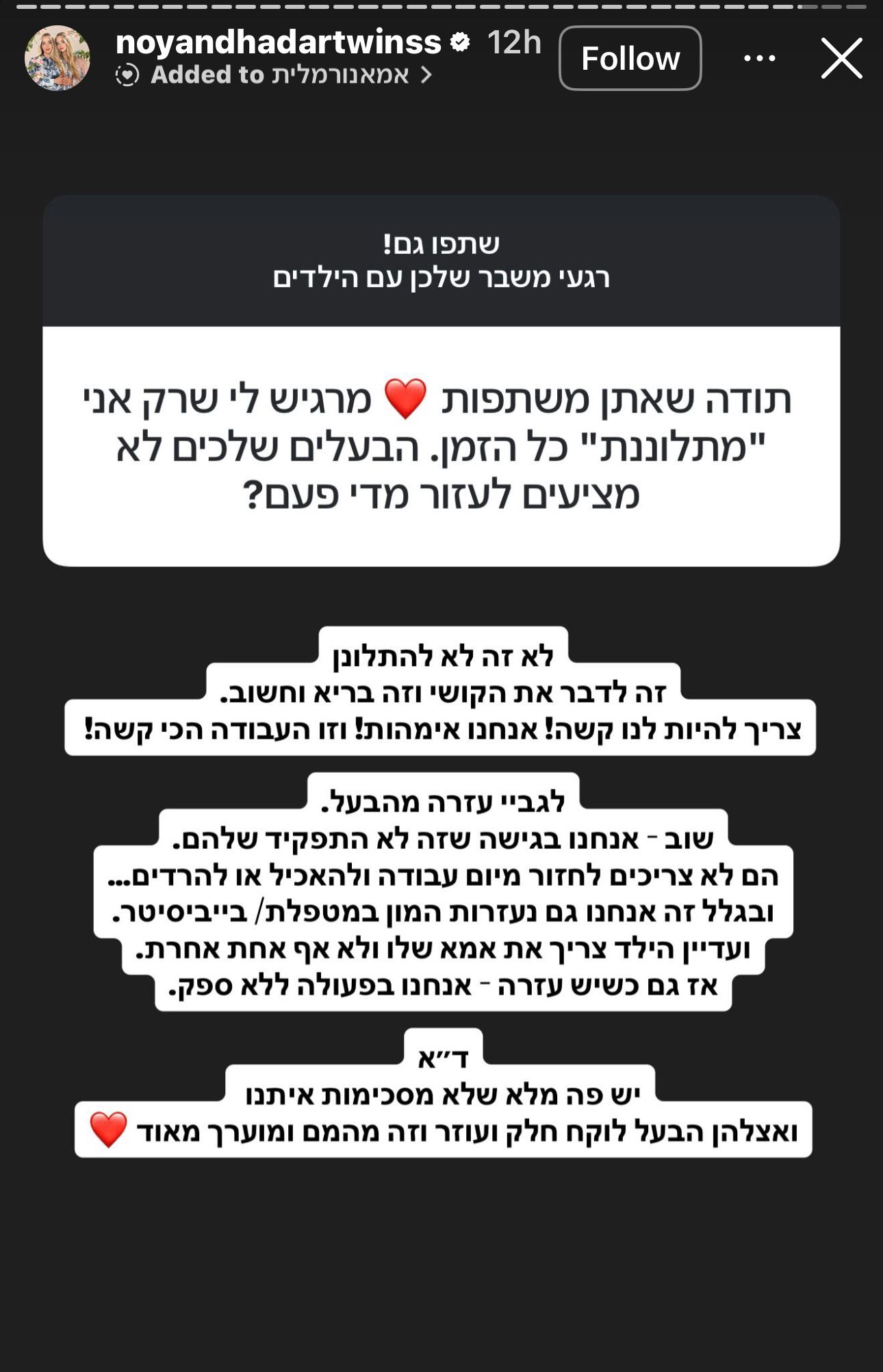עוד הוסיפו: "לגבי עזרה מהבעל, שוב – אנחנו בגישה שזה לא התפקיד שלהם. הם לא צריכים לחזור מיום עבודה ולהאכיל או להרדים… ובגלל זה אנחנו גם נעזרות המון במטפלת / בייביסיטר, ועדיין הילד צריך את אמא שלו ולא אף אחת אחרת, אז גם כשיש עזרה – אנחנו בפעולה ללא ספק.