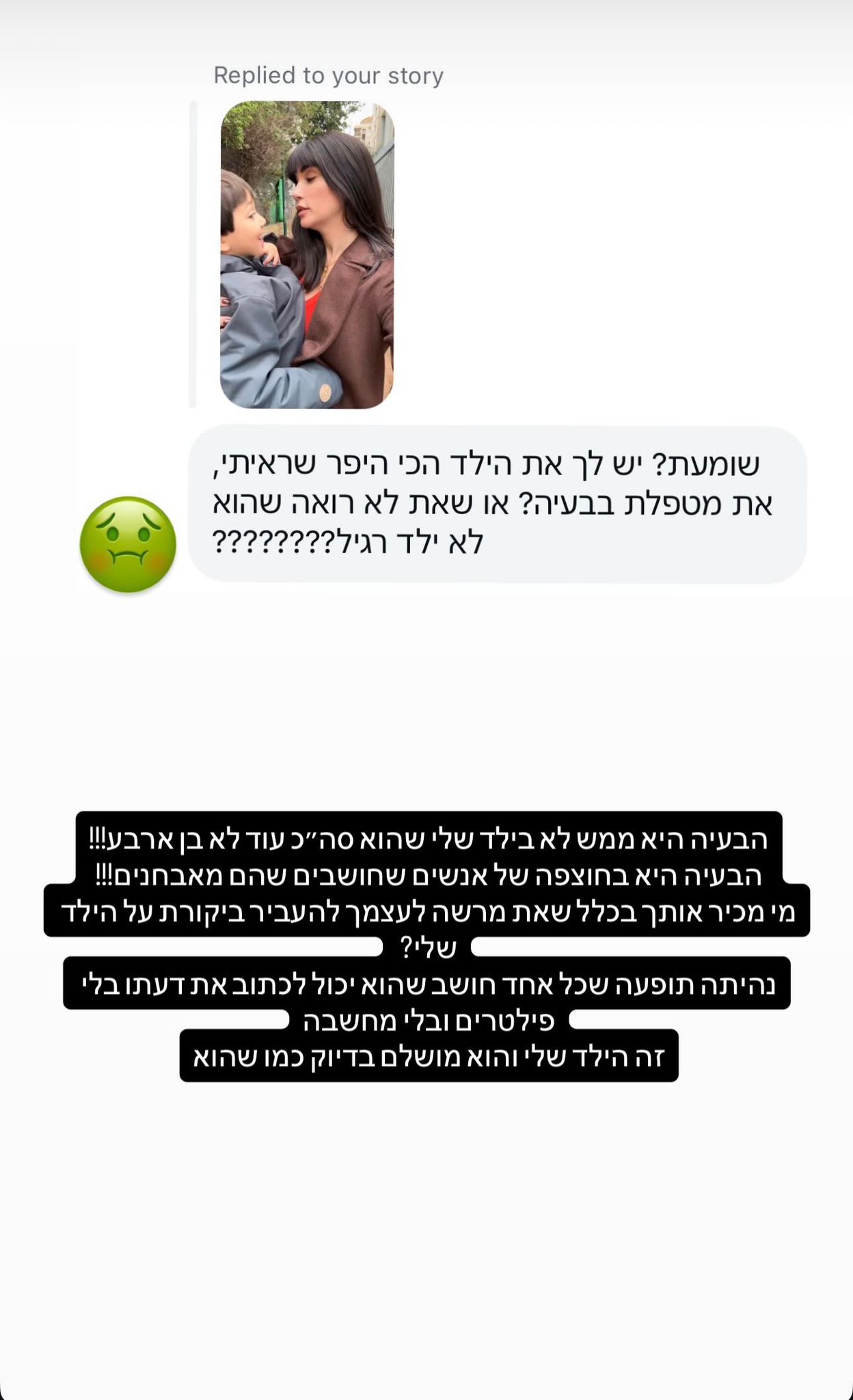 הדוגמנית בחרה לשתף צילום מסך של ההודעה, והגיבה בתקיפות: : "הבעיה היא ממש לא בילד שלי שהוא סך הכל עוד לא בן ארבע!!! הבעיה היא בחוצפה של אנשים שחושבים שהם מאבחנים!!! מי מכיר אותך בכלל שאת מרשה לעצמך להעביר ביקורת על הילד שלי?"; צפו בסטורי.