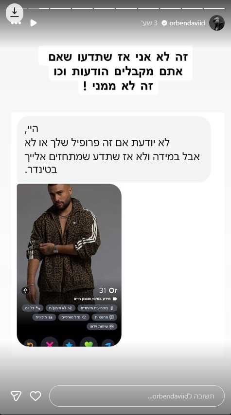 בן דוד שיתף בסטורי שהעלה היום (חמישי) לחשבון האינסטגרם שלו את ההודעה שקיבל מאותה עוקבת עם צילום מסך של הפרופיל המזויף שלו ב"טינדר" והזהיר את העוקבים שלו כשכתב ברקע: "זה לא אני, אז תדעו שאם אתה מקבלים הודעות וכו' זה לא ממני!".