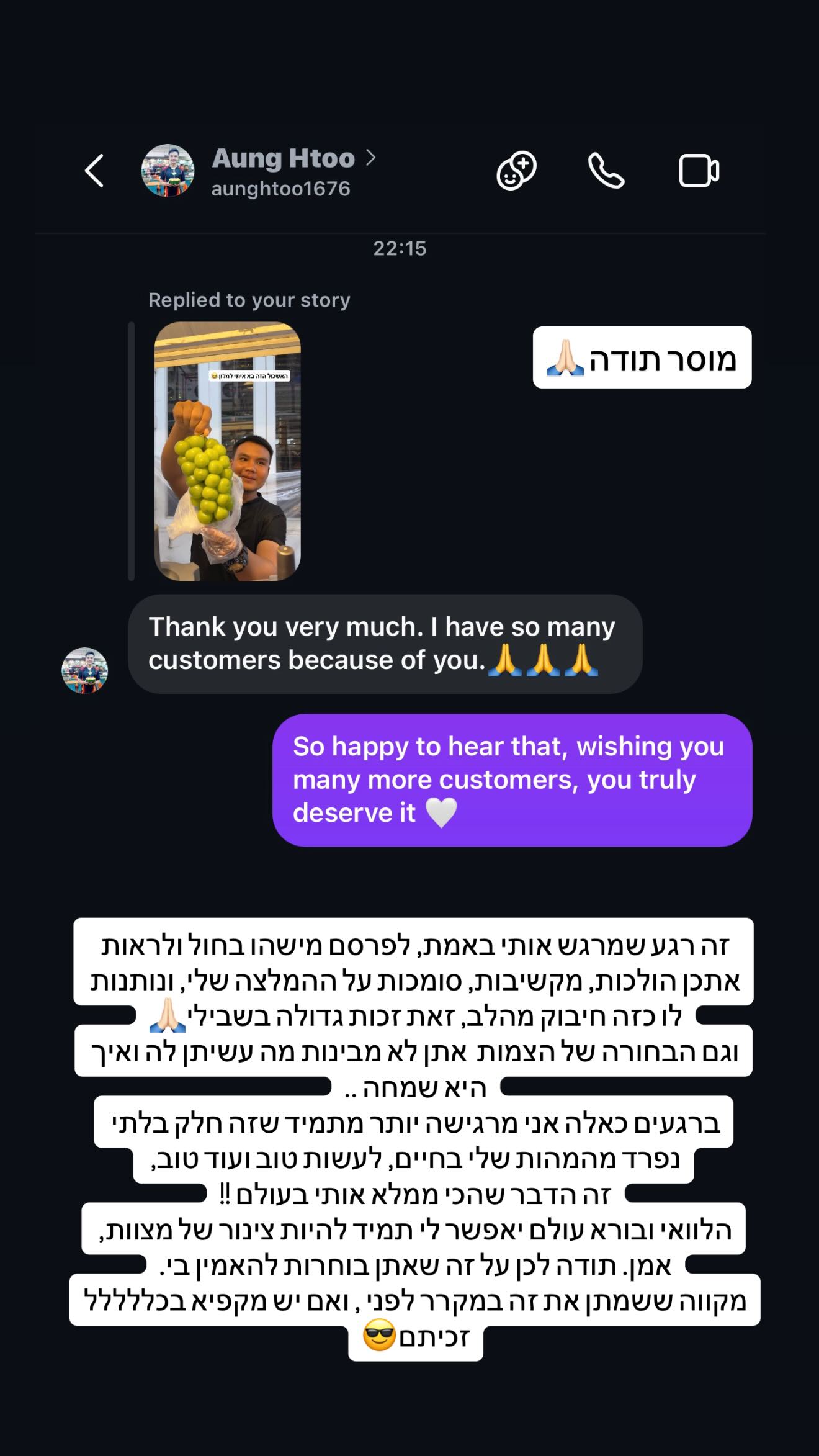 בסטורי שהיא שיתפה שיחה ובה קיבלה פרגון מבעל העסקי המקומי שכתב לה תודה על ההמלצה שלה בסטורי: "תודה רבה לך, הלוואי והיו הרבה לקוחות כמוך". והגיבה על כך: "זה רגע שמרגיש אותי באמת, לפרסם מישהו בחו"ל ולראות אתכן הולכות, מקשיבות, סומכות על ההמלצה שלי, ונותנות לו כזה חיבוק מהלב, זאת זכות גדולה בשבילי".