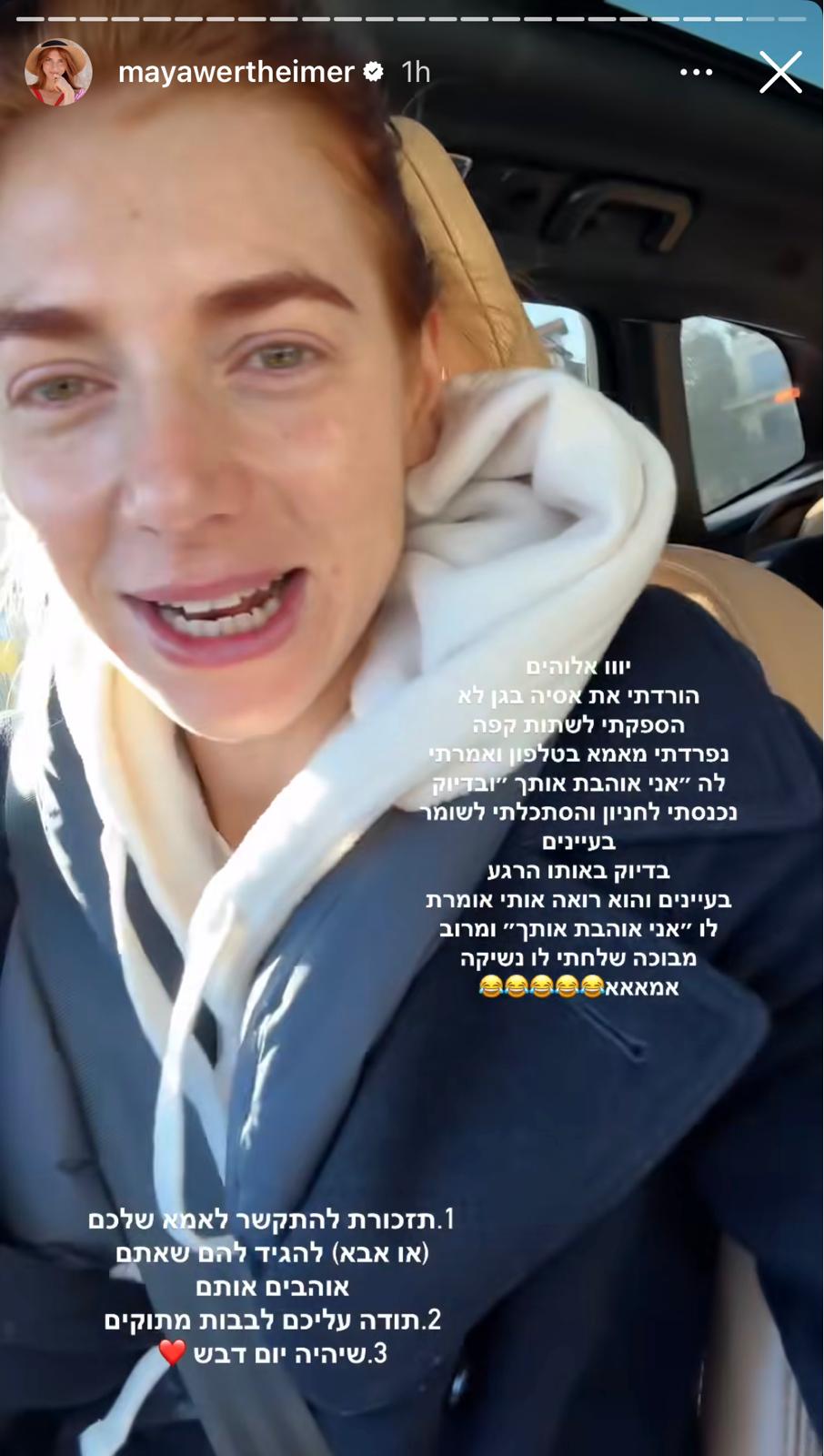 "יו אלוהים, הורדתי את אסיה בגן, לא הספקתי לשתות קפה. נפרדתי מאמא בטלפון ואמרתי לה 'אני אוהבת אותך' ובדיוק נכנסתי לחניון והסתכלתי לשומר בעיניים, בדיוק באותו הרגע הוא רואה אותי אומרת לו 'אני אוהבת אותך' ומרוב מבוכה שלחתי לו נשיקה אמא", כתבה. עוד הוסיפה והמליצה לעוקביה: "תזכורת להתקשר לאמא או אבא שלכם, להגיד להם שאתם אוהבים אותם. תודה עליכם לבבות מתוקים".