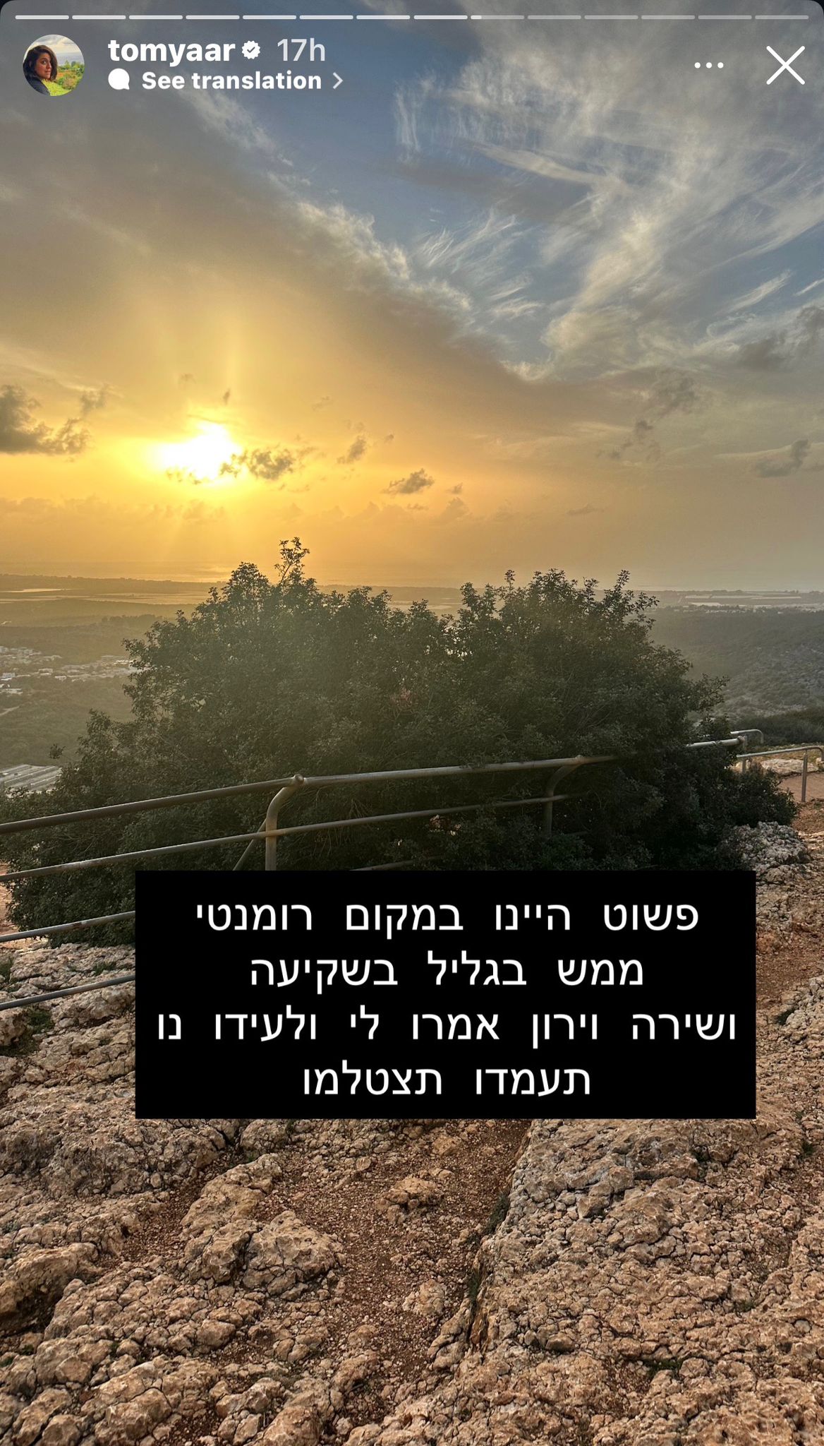 הרשתות החברתיות סערו ביממה האחרונה בעקבות תיעוד חריג במיוחד של הקומיקאית והשחקנית תום יער, שנצפתה מתנשקת עם גבר שאינו בעלה. התמונה בסטורי, שצולם על רקע שקיעה רומנטית בגליל, הופץ במהירות וגרר סיקור נרחב במדורי הרכילות, מה שהוביל צורך מיידי של יער גם להסביר בסטורי מה באמת קרה שם.