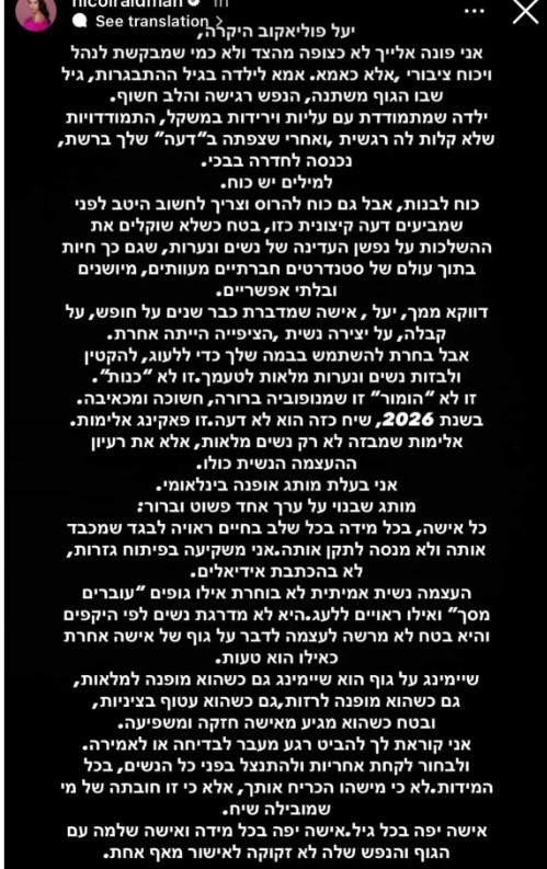 בסטורי שהעלתה כתבה ראידמן: "יעל פוליאקוב היקרה, אני פונה אלייך לא כצופה מהצד ולא כמי שמבקשת לנהל ויכוח ציבורי אלא כאמא. אמא לילדה בגיל ההתבגרות, גיל שבו הגוף משתנה, הנפש רגישה והלב חשוף.
