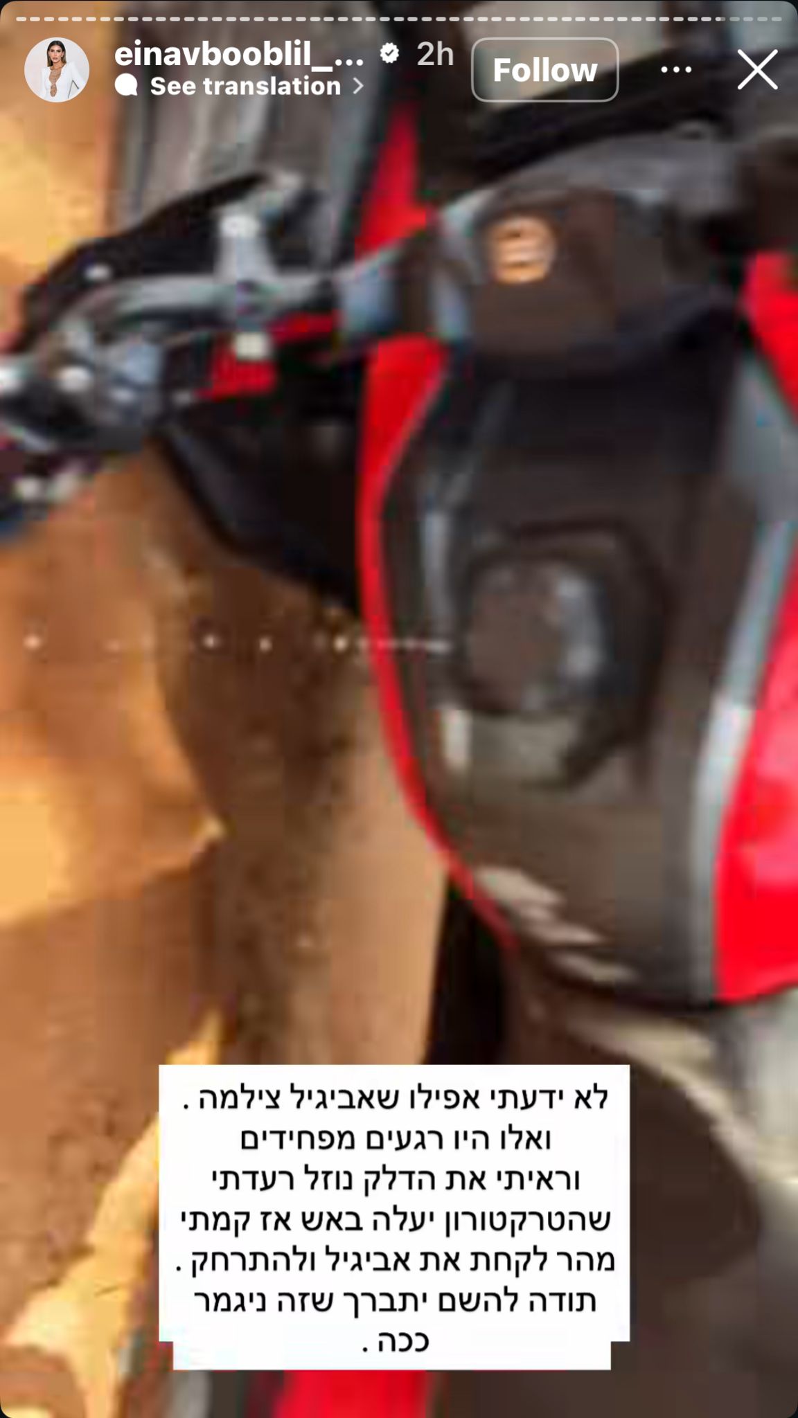 על גבי הסטורי שהעלתה, בובליל משתפת: "לא ידעתי אפילו שאביגיל צילמה. ואלו היו רגעים מפחידים, ראיתי את הדלק נוזל רעדתי שהטרקטורון יעלה באש אז קמתי מהר לקחת את אביגיל ולהתרחק. תודה להשם יתברך שזה נגמר ככה".