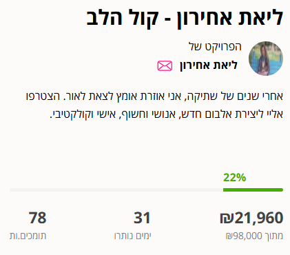 עוד נכתב באתר מה הייתה הסיבה לכתיבת הפוסט: "אחר שנים רבות כמנחה ושחקנית, בחרתי להתרחק מאור הזרקורים ולהתמסר לאימהות ולבית. לאחרונה הבנתי שאני לא יכולה יותר להשאיר את המוזיקה בצד- הכתיבה והשירה בערו בי. ברגע של כנות, שיתפתי ברשתות את מה שעובר עלי". עד כה, אחירון גייסה 21,960 שקל לאחר יממה אחת בלבד כאשר היעד המרכזי הוא 98 אלף שקל בעוד כחודש.