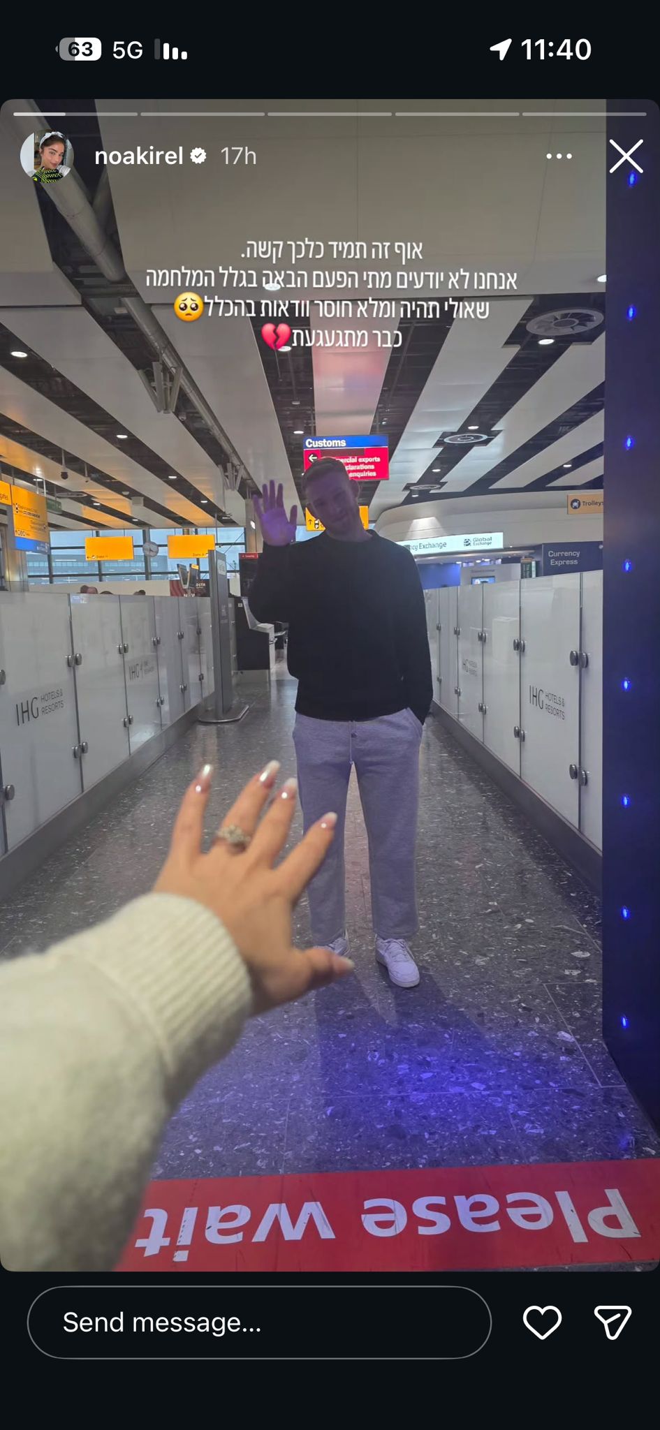 בסטורי שפרסמה הזמרת שיתפה את התחושות הכבדות שחווה בכל פעם שהיא נאלצת לחזור לארץ ונוכח למצב הביטחוני הגדול בין ישראל לאיראן. "אוף זה תמיד כל כך קשה. אנחנו לא ידועים מתי הפעם הבאה בגלל המלחמה שאולי תהיה. מלא חוסר וודאות בהכל, כבר מתגעגעת".