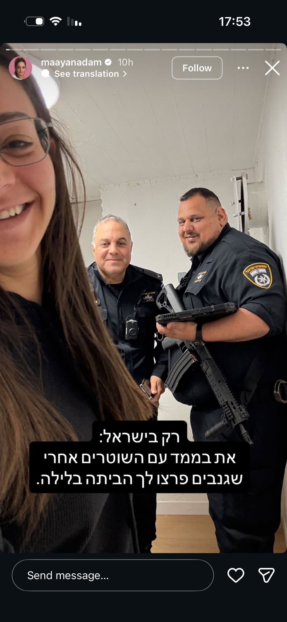 רגע לפני התקיפה הגדולה, ביתה של אדם נפרץ ובבוקר היא הזעיקה את משטרת ישראל כדי לחקור את המעשה בזמן שהחלו האזעקות הראשונה. "רק בישראל: את בממ"ד עם השוטרים אחרי שגנבים פרצו לך הביתה בלילה", עדכנה אדם את עוקביה בסטורי.
