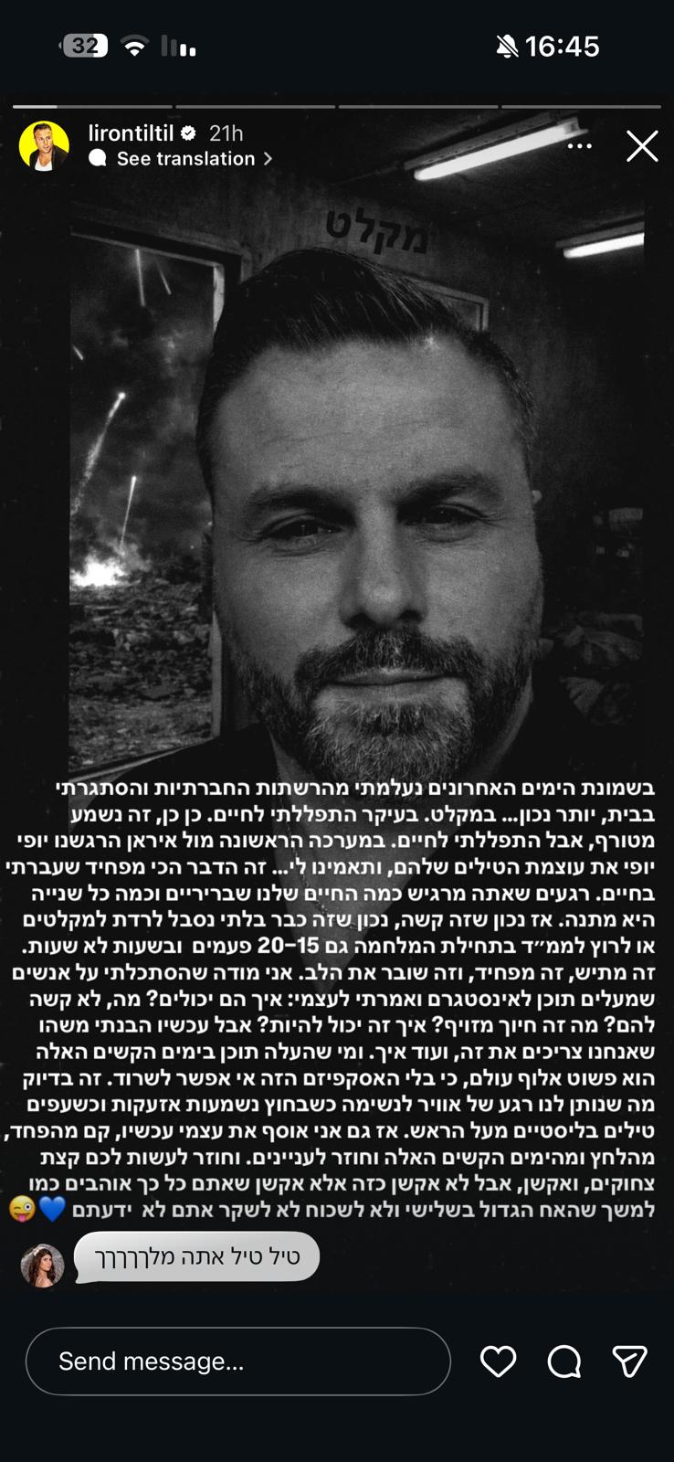 כוכב הרשת לירון אורפלי, טילטיל, נשבר ברשת החברתית אינסטגרם עם סטורי שהעלה אתמול (שבת) בו הוא משתף על הימים האחרונים מאז שהחלה המלחמה ומדוע הוא נעלם מהרשתות החברתיות.