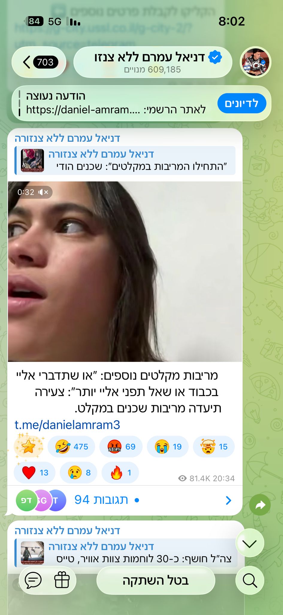 העיתונאי העצמאי, דניאל עמרם שמחזיק עמוד טלגרם פעיל של 609 אלף רשומים העלה את אותו סרטון של כוכבת "האח הגדול" וצבר נכון לכתיבת שורות אלו ל-81.4 אלף צפיות.