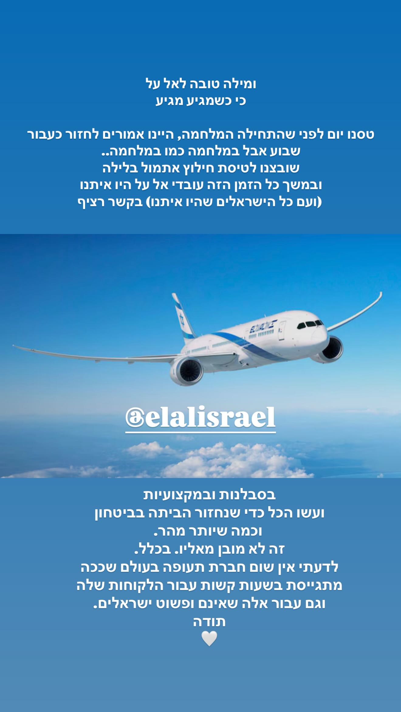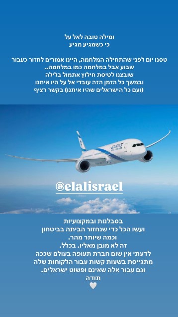 בסטורי שהעלתה כתבה הדוגמנית: "מילה טובה לאל על כי כשמגיע מגיע. טסנו יום לפני שהתחילה המלחמה, היינו אמורים לחזור כעבור שבוע אבל במלחמה כמו במלחמה.. שובצנו לטיסת חילוץ אתמול בלילה ובמשך כל הזמן הזה עובדי אל על היו איתנו (ועם כל הישראלים שהיו איתנו) בקשר רציף, בסבלנות ובמקצועיות, עשו הכל כדי שנחזור הביתה בביטחון וכמה שיותר מהר".