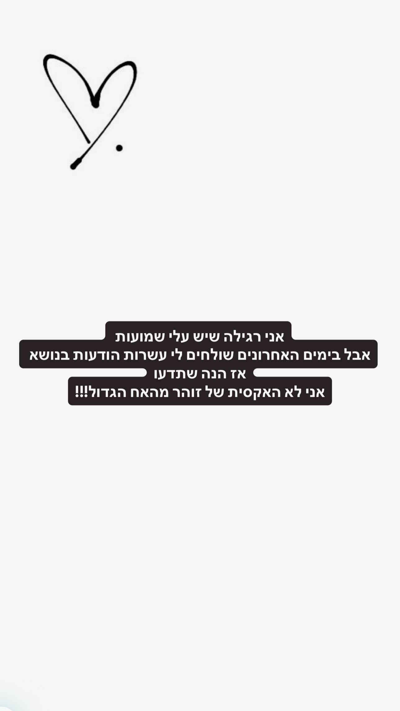 הערב (ראשון) הדוגמנית שיר אלמליח התייחסה לשמועות שהחלו לרוץ ברשת על כך שהיו בעבר בקשר. "אני רגילה שיש עליי שמועות, אבל בימים האחרונים שולחים לי עשרות הודעות בנושא", כתבה בחשבון האינסטגרם שלה. אלמליח הבהירה באופן ברור וחדש משמעי: "אז הנה שתדעו, אני לא האקסית של זוהר מ'האח הגדול'".