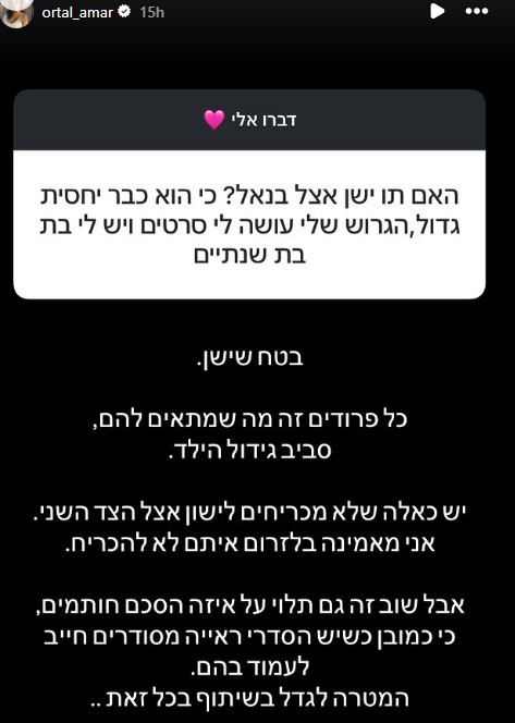 המשפיענית ואשת התקשורת אורטל עמר פתחה אתמול תיבת שאלות בחשבון האינסטגרם שלה, ושיתפה את העוקבים בפרטים מחייה האישיים. במסגרת הסשן, עמר ענתה באופן ישיר על סוגיות הנוגעות להורות משותפת, להסדרי ראייה, ולמערכת היחסים הנוכחית שלה.