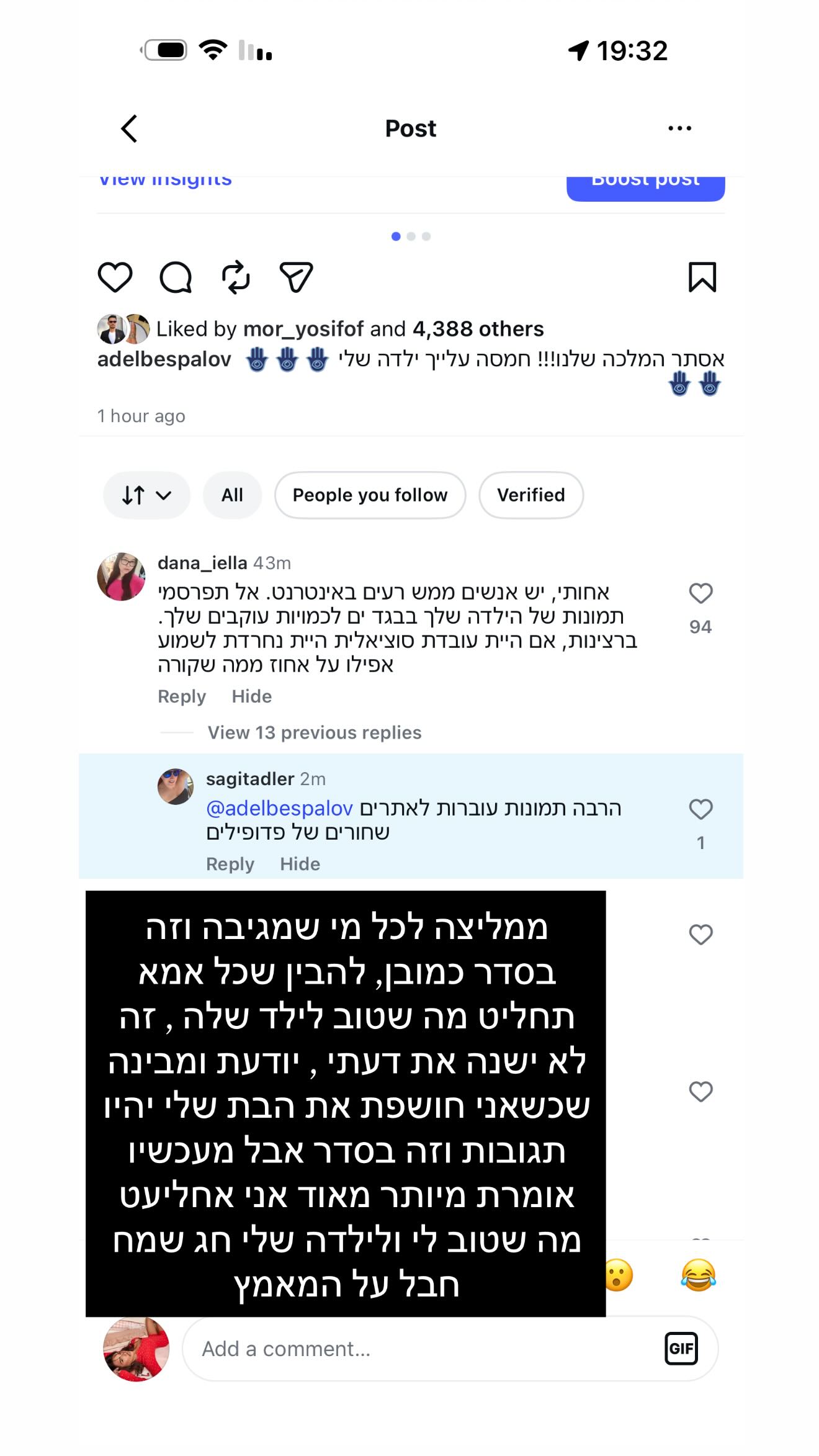 אחת הגולשות כתבה: "ילדה מהממת בטירוף. אבל למה בפוזה כזאת? הילדה לא יודעת את המשמעות של הדבר ואת בתור אמא שלה כן… קצת אחריות". עוד תגובה בולטת הייתה: "אחותי, יש אנשים ממש רעים באינטרנט. אל תפרסמי תמונות של הילדה שלך בבגד ים לעוקבים שלך. ברצינות, אם היית עובדת סוציאלית היית נחרדת לשמוע אפילו על אחוז ממה שקורה".