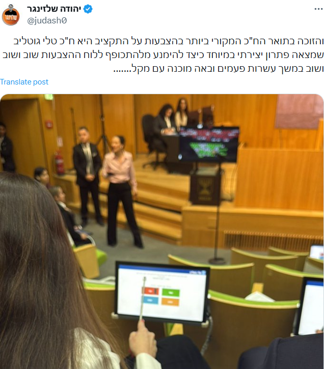 במליאת הכנסת העבירו אמש את תקציב המדינה לאחר לילה ארוך ודרמטי במיוחד. חברת הכנסת טלי גוטליב הגיעה מוכנה היטב לקראת ההצבעות. היא גנבה את ההצגה כשהשתמשה במקל טאצ' מיוחד שאיתו הצביעה, וזאת כדי לחסוך לעצמה את הצורך להתכופף כל פעם שצריך להצביע.