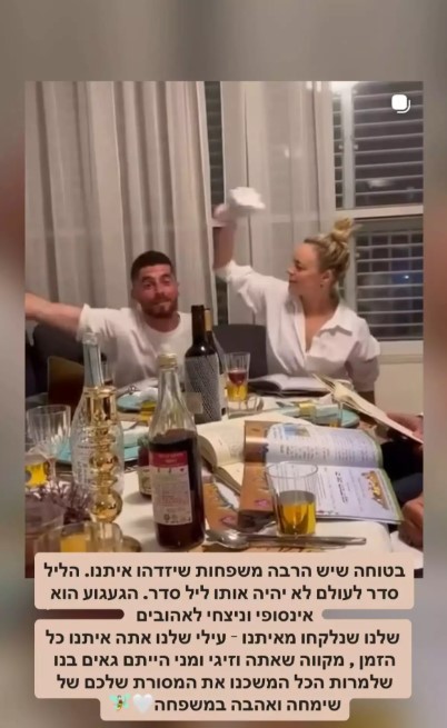 עוד הוסיפה: "ליל הסדר לעולם לא יהיה אותו דבר. הגעגוע הוא אינסופי וניצחי לאהובים שלנו שנלקחו מאיתנו - עילי שלנו אתה איתנו כל הזמן, מקווה שאתה, וזיגי ומני הייתם גאים בנו שלמרות הכל המשכנו את המסורת שלכם של שמחה ואהבה במשפחה".