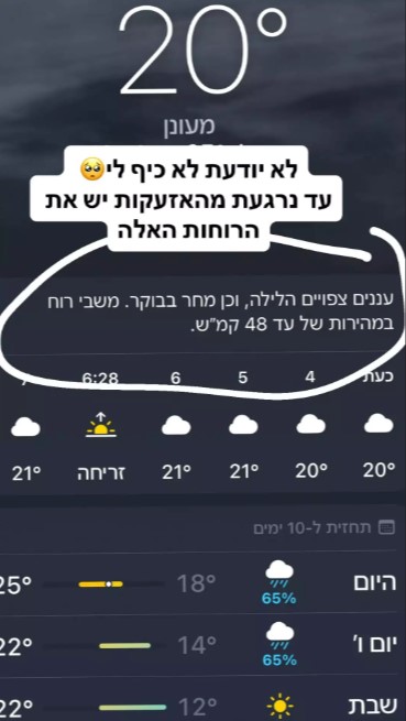 בר זוהר העלתה סטורי נוסף לחשבון האינסטגרם שלה, אליו צירפה את תחזית מזג האוויר וכתבה ברקע: "לא יודעת, לא כיף לי. עד שנרגעת מהאזעקות אז יש את הרוחות האלה".