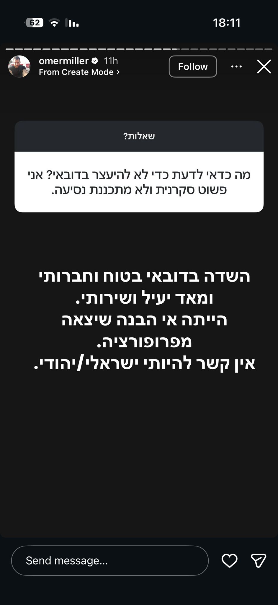 היום (שבת) במסגרת שאלות-תשובות בחשבון האינסטגרם שלו השף שפך קצת אור על המקרה וסיפר מדוע הוא נעצר. "השדה בדובאי בטוח וחברותי ומאוד יעיל ושירותי. הייתה אי הבנה שיצאה מפרופורציה", כתב והבהיר: "אין קשר להיותי ישראלי או יהודי".