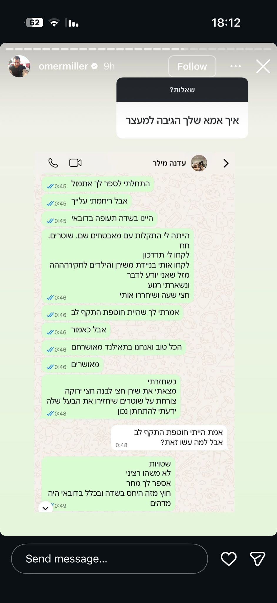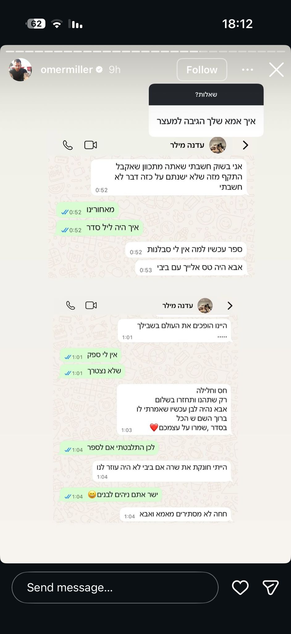 בסטורי אחר נשאל איך אמו, עדנה הגיבה למעצר ושיתף את השיחה ביניהם בוואטסאפ: