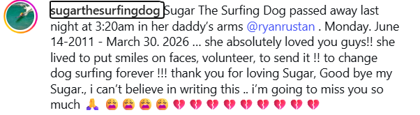 ראיין ראסטן, אימץ אותה לאחר שמצא אותה משוטטת ברחובות קליפורניה כשהיא תינוקת בת 7 חודשים בלבד. לאחר מותה הוא כתב פוסט מרגש באינסטגרם בו סיפר על הכלבה המיוחדת שהייתה עבורו: "היא שרדה כדי להעלות חיוכים על הפנים, להתנדב למען הקהילה ולשנות את גלישת הכלבים לנצח". בפוסט הוא נפרד ממנה: "להתראות שוגר שלי, אני לא מאמין שאני כותב את זה. אני אתגעגע אלייך כל כך".