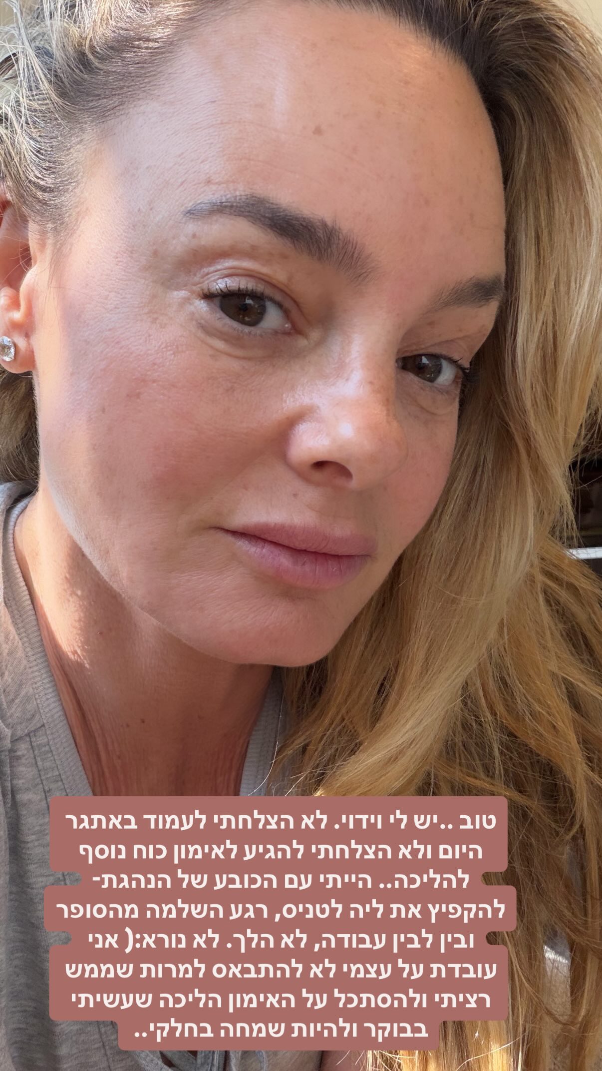 "לא הצלחתי להגיע לאימון כוח נוסף להליכה. הייתי עם הכובע של הנהגת - להקפיץ את ליה לטניס, רגע השלמה מהסופר ובין לבין עבודה, לא הלך, לא נורא", כתבה בר זוהר והוסיפה: "אני ממש עובדת על עצמי לא להתבאס למרות שממש רציתי להסתכל על האימון הליכה שעשיתי בבוקר ולהיות שמחה בחלקי".