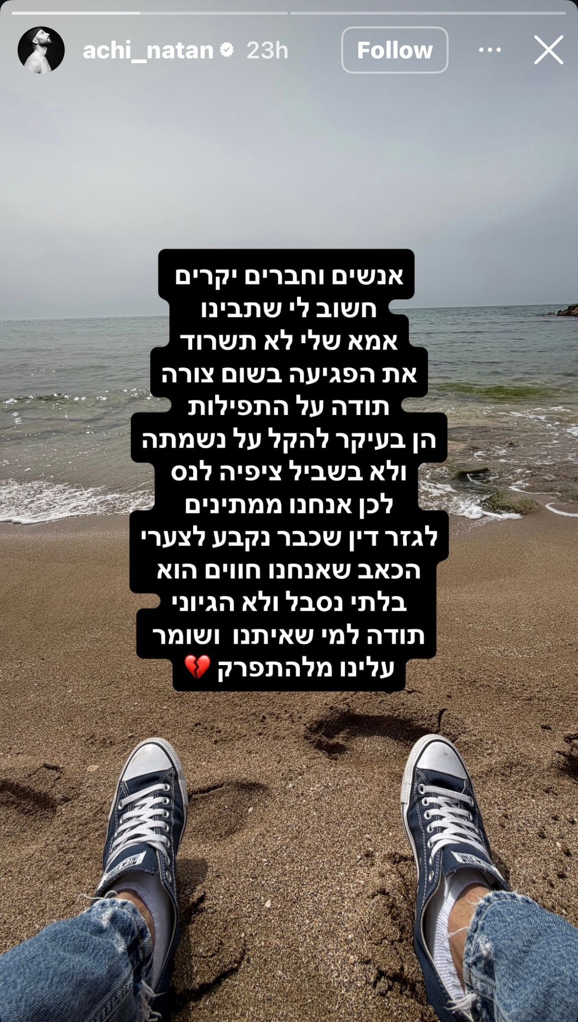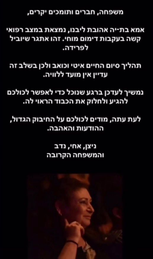 אחי נתן שיתף ברשתות מוקדם יותר השבוע במצבה הבריאותי הקשה של אימו, לאחר שעברה שבץ. בסטורי שפרסם כתב נתן: "משפחה, חברים ותומכים יקרים, אמא בת-יה האהובה ליבנו, נמצאת במצב רפואי קשה בעקבות דימום מוחי. זהו אתגר שיוביל לפרידה. תהליך סיום החיים איטי וכואב ולכן בשלב זה עדיין אין מועד ללוויה. נמשיך לעדכן ברגע שנוכל כדי לאפשר לכולכם להגיע ולחלוק את הכבוד הראוי לה. לעת עתה, מודים לכולכם על החיבוק הגדול, ההודעות והאהבה".