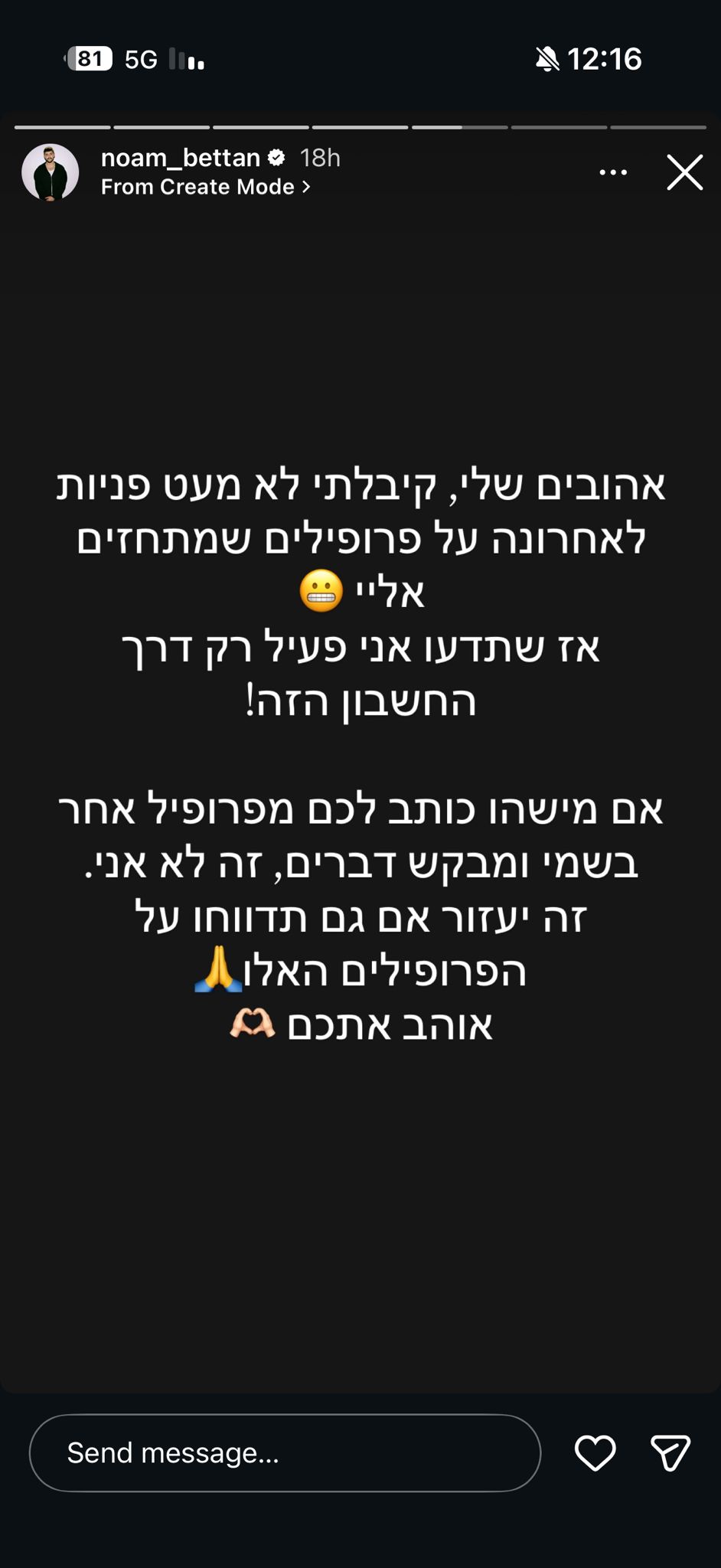 "אהובים שלי, קיבלתי לא מעט פניות לאחרונה על פרופילים שמתחזים אליי", כתב בחשבון האינסטגרם שלו. "אז שתדעו אני פעיל רק דרך החשבון הזה!". עוד הוסיף והדגיש כי זה החשבון הרשמי שלו וביקש דבר אחד: "אם מישהו כותב לכם מפרופיל אחר בשמי ומבקש דברים, זה לא אני. זה יעזור אם גם תדווחו על הפרופיל האלו. אוהב אתכם".