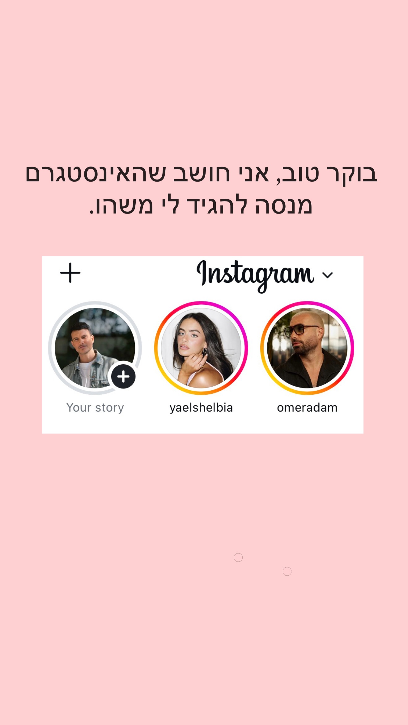 בחשבון האינסטגרם שלו צירף צילום מסך מתוך האינסטגרם שלו בו הוצגו הסטוריז של עומר אדם ויעל שלביה אחד לצד השני וכתב: "בוקר טוב, אני חושב שהאינסטגרם מנסה להגיד לי משהו".
