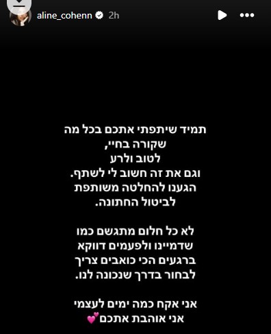 ההודעה הרשמית הגיעה ישירות מחשבון האינסטגרם של כהן, שם כתבה לעוקביה: "תמיד שיתפתי אתכם בכל מה שקורה בחיי, לטוב ולרע וגם את זה חשוב לי לשתף. הגענו להחלטה משותפת לביטול החתונה. לא כל חלום מתגשם כמו שדמיינו, ולפעמים דווקא ברגעים הכי כואבים צריך לבחור בדרך שנכונה לנו. אני אקח כמה ימים לעצמי. אני אוהבת אתכם".