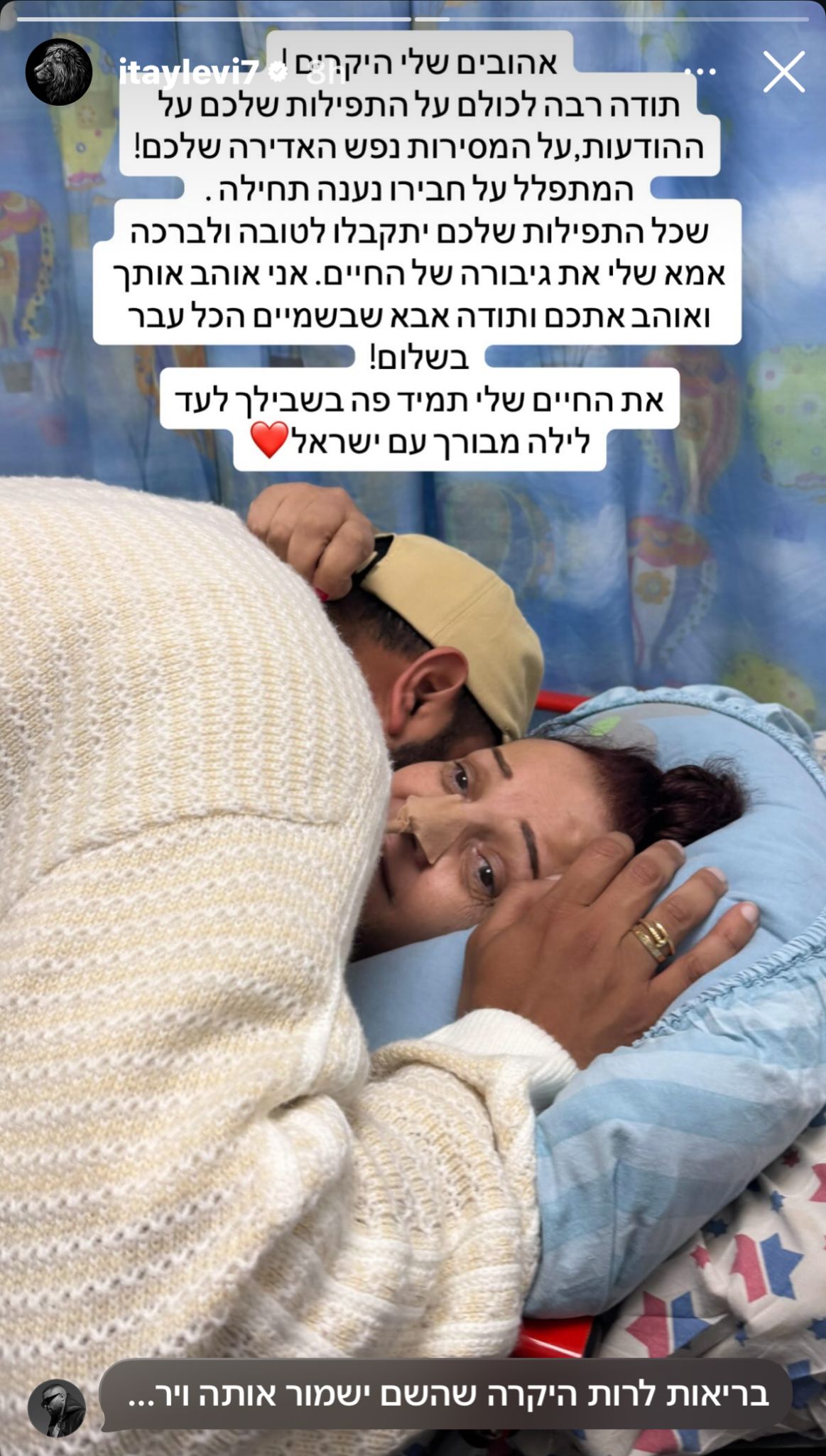 לוי פרסם במהלך הלילה תמונה עם אמו מבית החולים, בה השניים נראים מחובקים ומסר הודעה לעוקביו: "אהובים שלי היקרים! תודה רבה לכולם על התפילות שלכם על ההודעות, על המסירות נפש האדירה שלכם! המתפלל על חבירו נענה תחילה. שכל התפילות שלכם יתקבלו לטובה ולברכה אמא שלי את גיבורה של החיים".