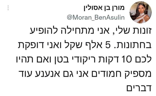 בציוץ המדובר, מחשבון ששמו 'מורן בן אסולין' כתוב: "זונות שלי, אני מתחילה להופיע בחתונות. 5 אלף שקל ואני דופקת לכם 10 דקות ריקודי בטן, ואם תהיו מספיק חמודים אני גם אנענע עוד דברים".