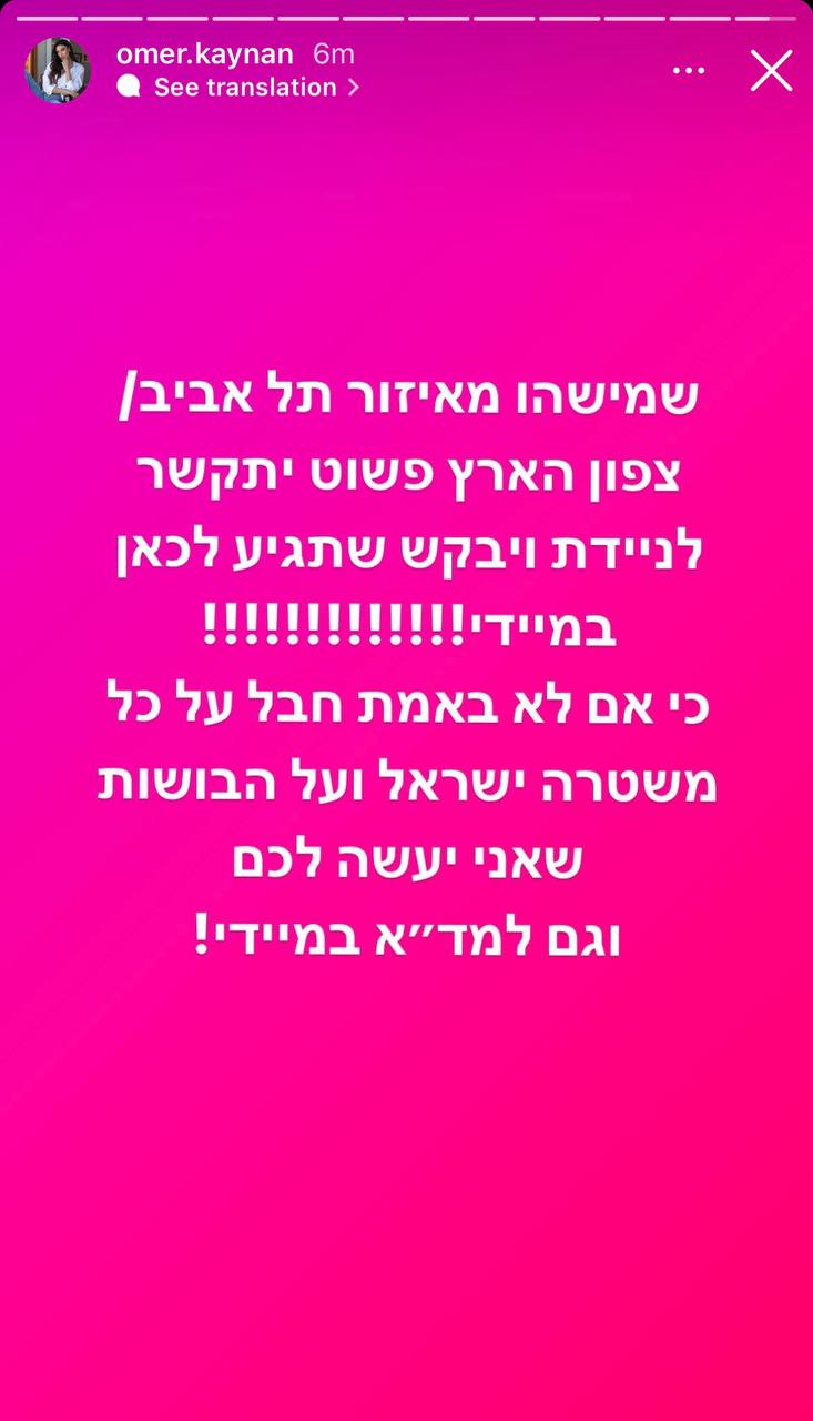 "שמישהו מאיזור תל אביב/צפון הארץ פשוט יתקשר לניידת ויבקש שתגיע לכאן במיידי", כתבה בסטורי. "כי אם לא באמת חבל על כל משטרת ישראל ועל הבושות שאני יעשה לכם וגם למד"א במיידי."