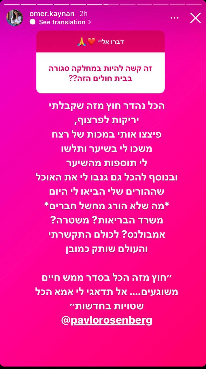 עצוב: כוכבת "האח הגדול" לשעבר והאקסית של פליט הריאליטי ג'וזי זירה, עומר קינן, העלתה היום (שבת) סטוריז מדאיגים במיוחד לאינסטגרם שלה, כאשר היא שיתפה את עוקביה על תהליך האשפוז שהיא עוברת בבית חולים לבריאות הנפש בפרדסיה.