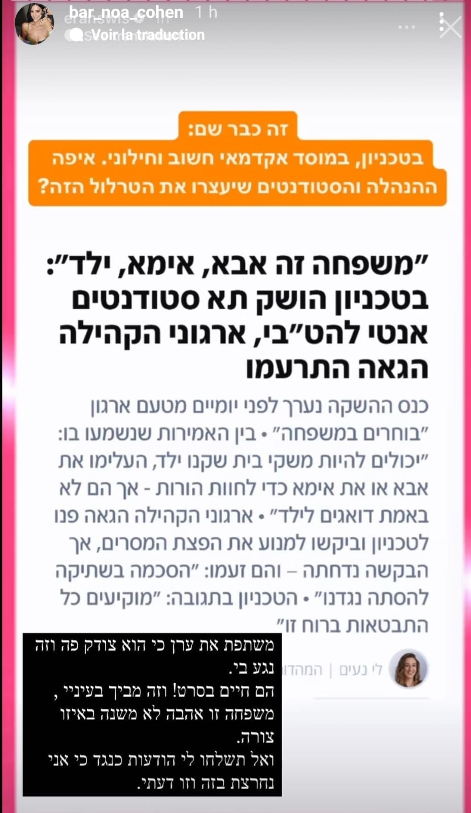 מי שהדהדה את המסר שלו היא הפיינליסטית של העונה האחרונה של "האח הגדול", בר נועה כהן. על הסטורי של סויסה ששיתפה, הוסיפה כהן בזעם: "משתפת את ערן כי הוא צודק פה וזה נגע בי. הם חיים בסרט! וזה מביך בעיניי, משפחה זו אהבה לא משנה באיזו צורה."
