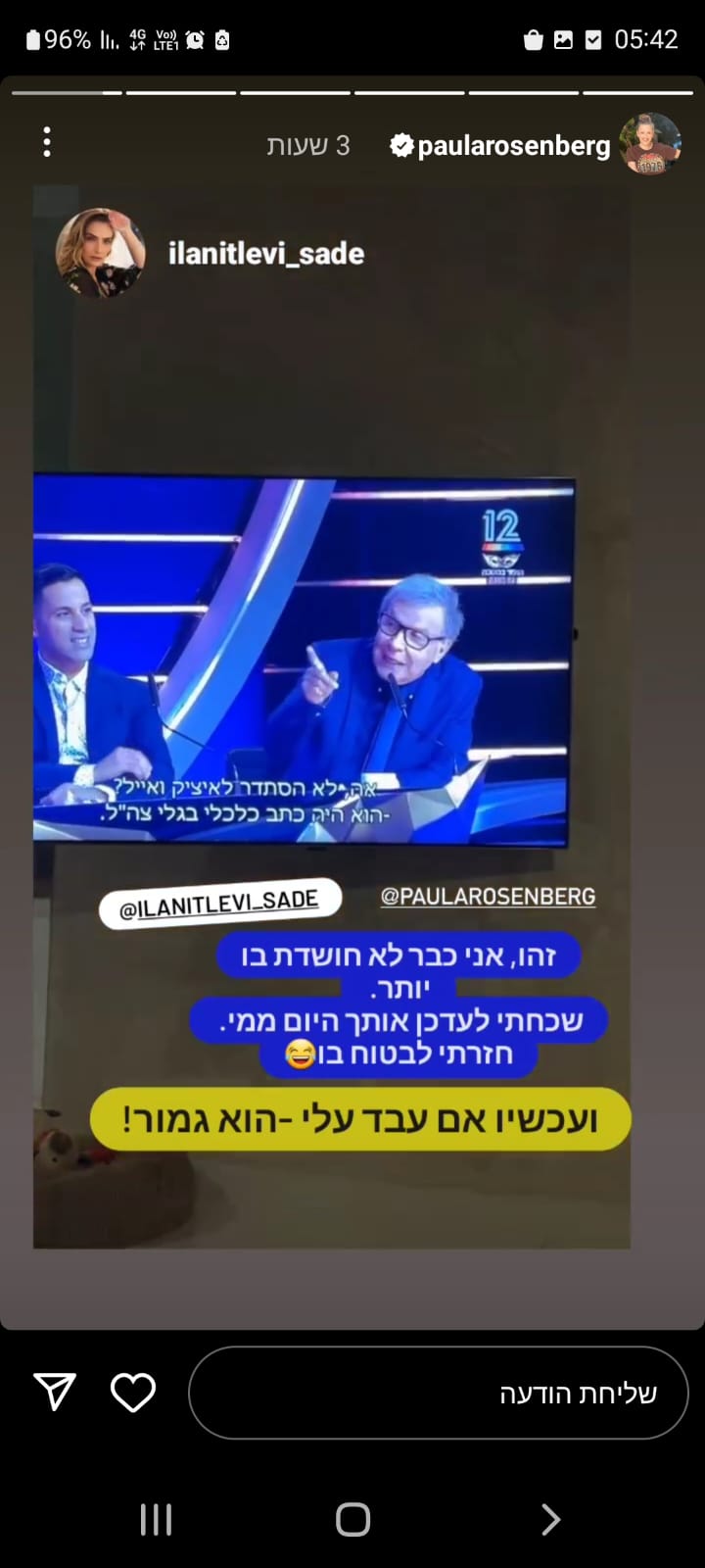 רוזנברג העלתה סטורי בשיתוף צילום מסך מאילנית לוי וכתבה: "זהו, אני כבר לא חושבת בו יותר, שכחתי לעדכן אותך היום מאמי. חזרתי לבטוח בו, עכשיו אם עבד עליי, הוא גמור".