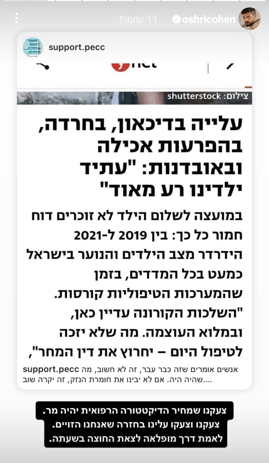היום, הגיב השחקן לדו"ח של המועצה לשלום הילד שהתפרסם השבוע וחשף מציאות פוסט-קורונה עגומה. "צעקנו שמחיר הדיקטטורה הרפואית יהיה מר." כתב כהן באינסטגרם, "צעקנו וצעקו עלינו בחזרה שאנחנו הזויים. לאמת דרך מופלאה לצאת החוצה בשעתה."