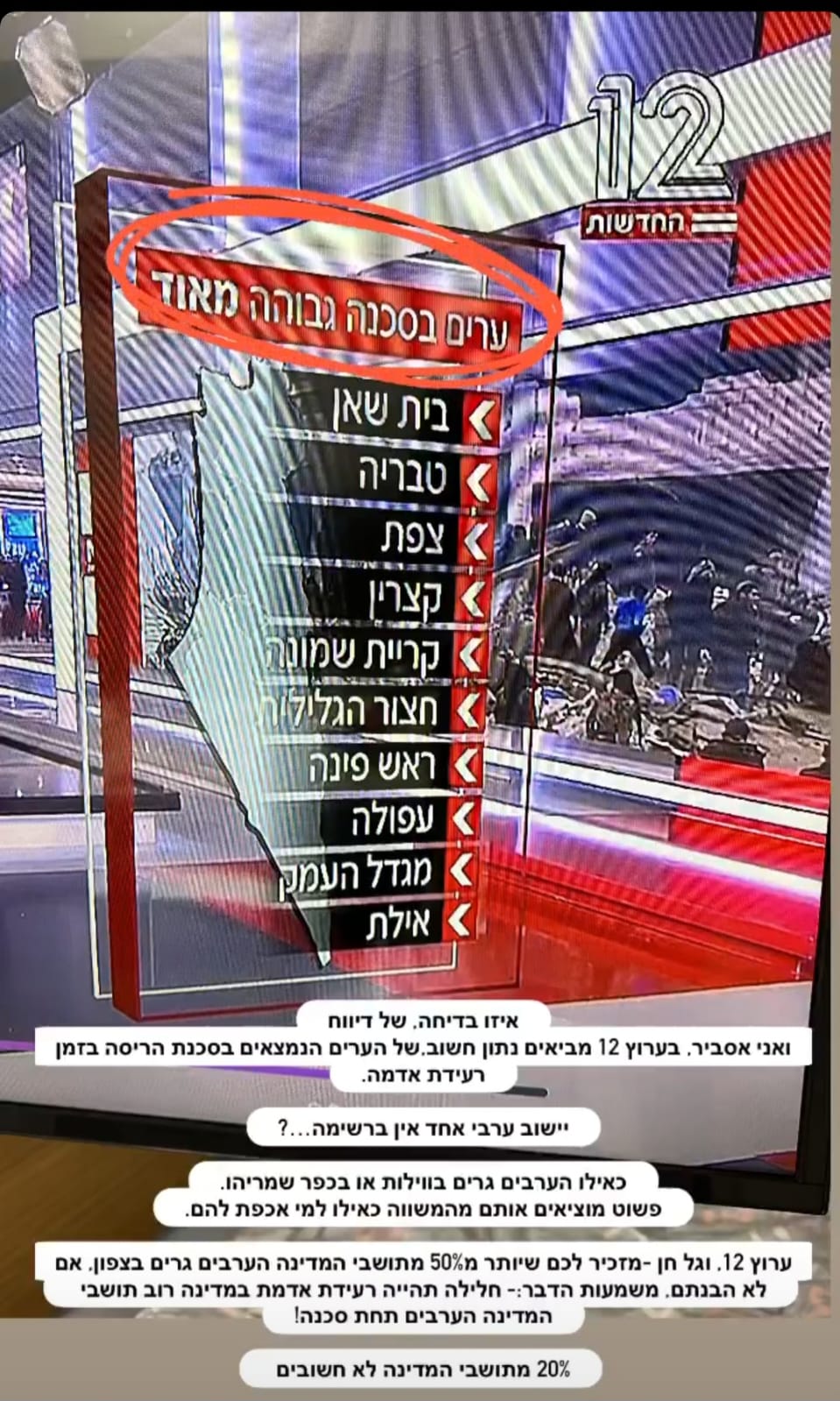 "פשוט מוציאים אותו מהמשוואה", זעם. "כאילו למי אכפת מהם", הוסיף ואז פנה ישירות לכתב ולמערכת החדשות: "ערוץ 12 וגל חן, מזכיר לכם שיותר מ-50% מתושבי המדינה הערבים גרים בצפון. אם לא הבנתם, משמעות הדבר היא שאם חלילה תהיה רעידת אדמה במדינה, רוב תושבי המדינה הערבים תחת סכנה. 20% מתושבי המדינה לא חשובים", סיכם.