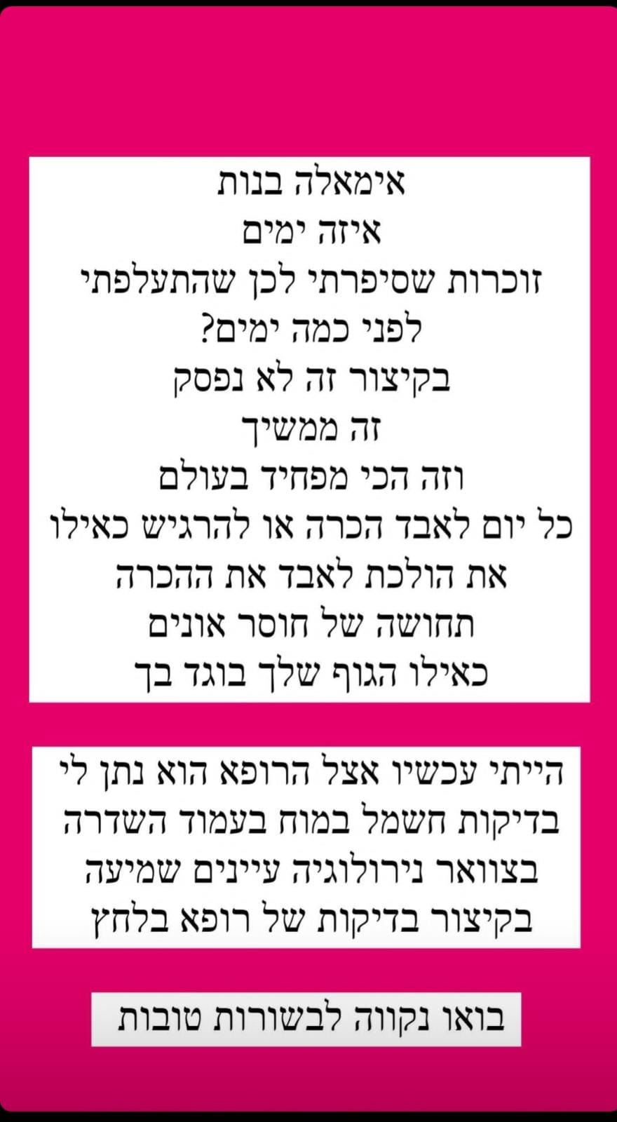"אמאל'ה בנות איזה ימים", פתחה סביניק את הסטורי בטון מלחיץ. "זוכרות שסיפרתי לכן שהתעלפתי לפני כמה ימים? ", הזכירה לעוקביה שלא מדובר באפיזודה חד פעמית חולפת. "בקיצור זה לא נפסק. זה ממשיך וזה הכי מפחיד בעולם", שיתפה סביניק בדרמה ובתחושת חוסר האונים שמציפה אותה.