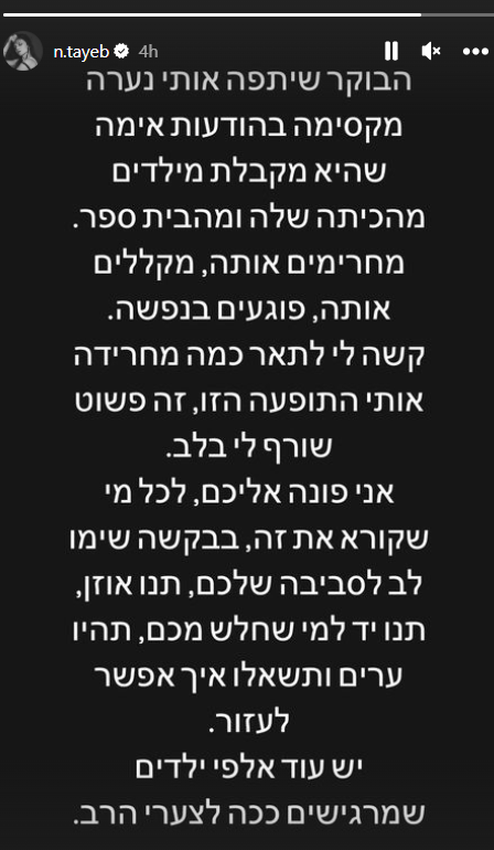 נינט הוסיפה בפנייה לעוקבים שלה, "אני פונה אליכם, לכל מי שקורא את זה, בבקשה שימו לב לסביבה שלכם, תנו אוזן, תנו יד למי שחלש מכם, תהיו ערים ותשאלו איך אפשר לעזור."