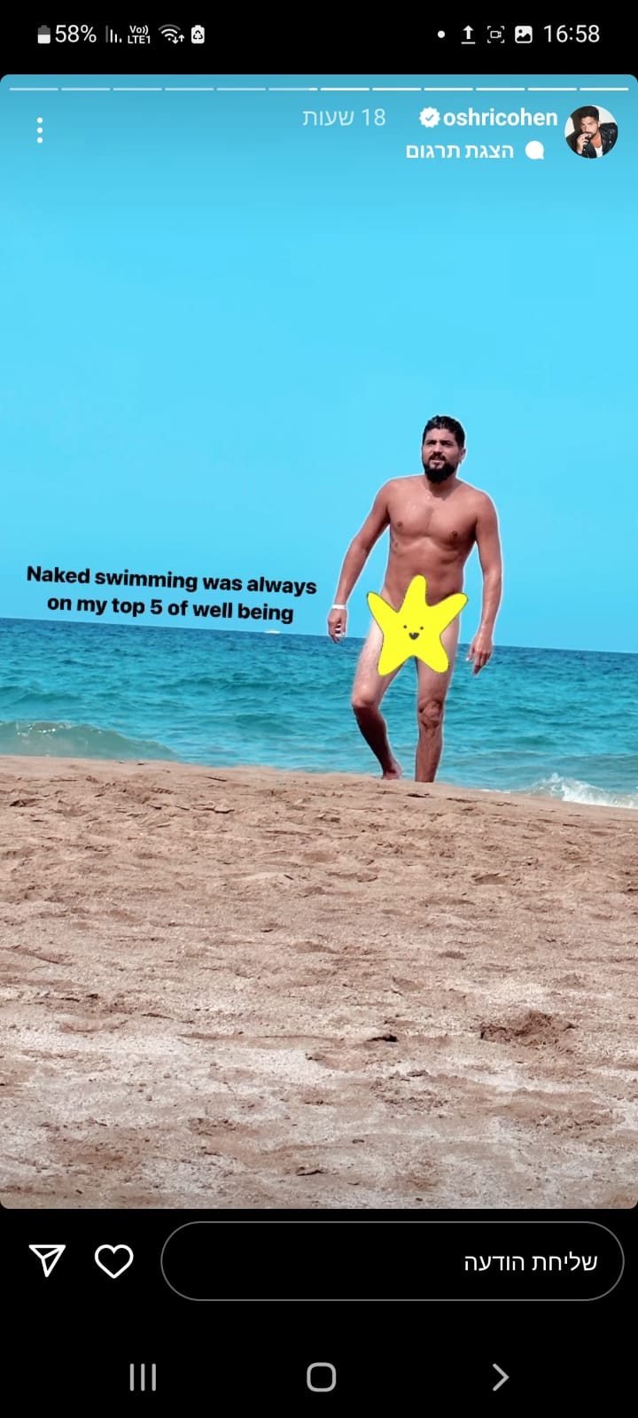 "לשחות בעירום תמיד היה בין הטופ 5 שלי", כתב כהן בסטורי שהעלה לרשתות החברתיות כשהוא בעירום מלא ורק אימוג'י של כוכב מסתיר את איבר מינו על רקע הים מאחוריו.
