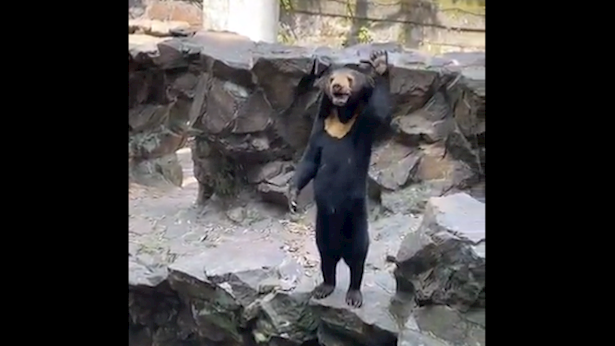 This is a real bear, not a human dressed in costumes! A four-year-old Malayan sun bear named Angela in a Hangzhou zoo went viral on China's social media as a video showed the world's smallest bear standing upright and waving to tourists just like a human. pic.twitter.com/Azv2tTVJhv