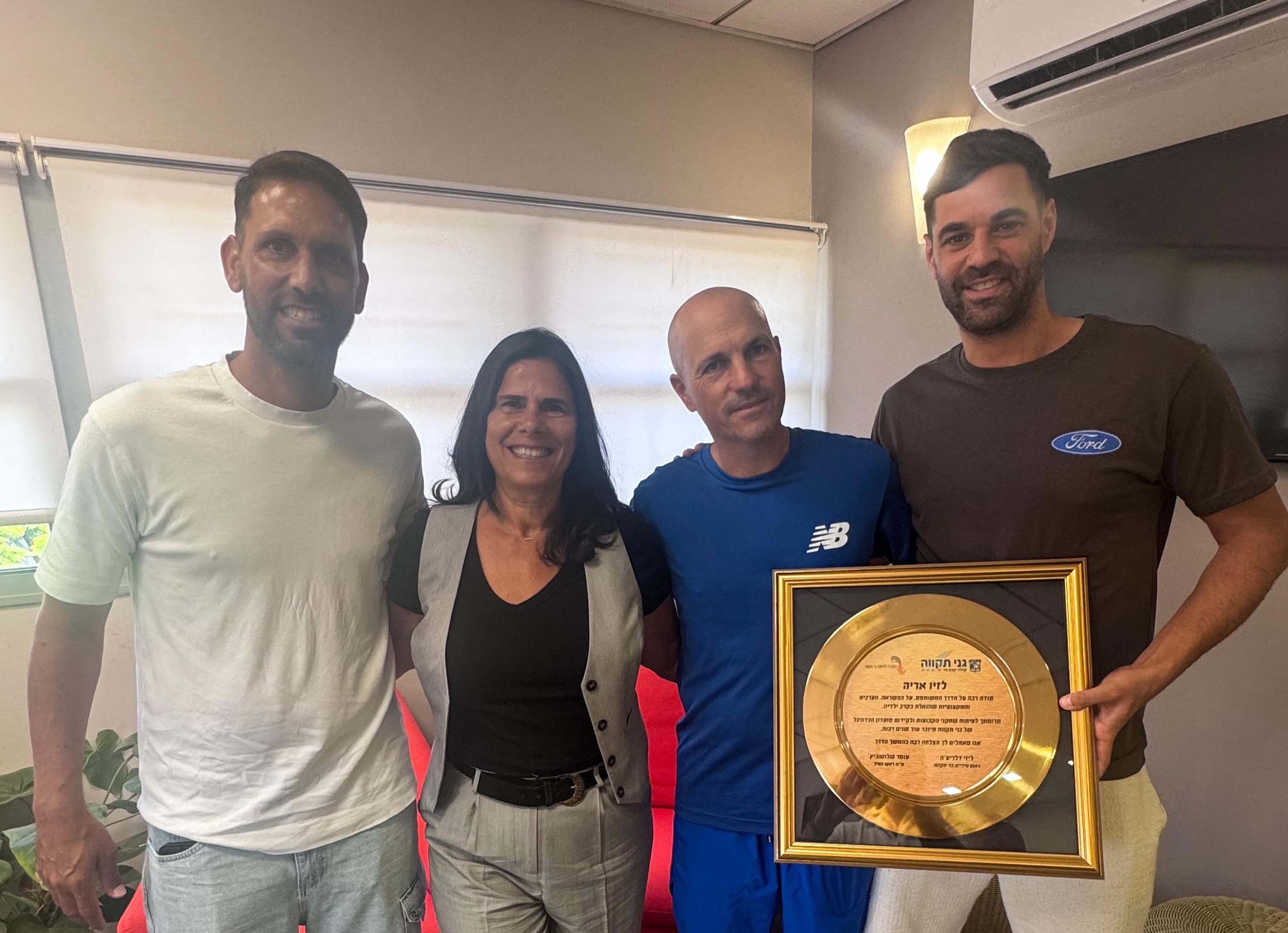 זיו אריה עם ראש העיר ליזי דלריצה וצוות האימון שלומי ארבייטמן ודן פוזננסקי. קרדיט צילום: דוברות העירייה