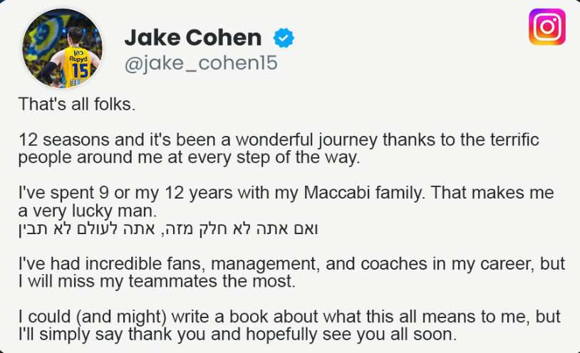 ג'ייק כהן כתב בפוסט שפרסם באינסטגרם: "זה הכל חבר'ה. 12 עונות, וזה היה מסע מופלא תודות לאנשים נפלאים שסבבו אותי בכל רגע ורגע. 9 עונות מתוכן הייתי במשפחת מכבי תל אביב, וזה עושה אותי בן אדם בר מזל. ואם אתה לא חלק מזה, אתה לעולם לא תבין".